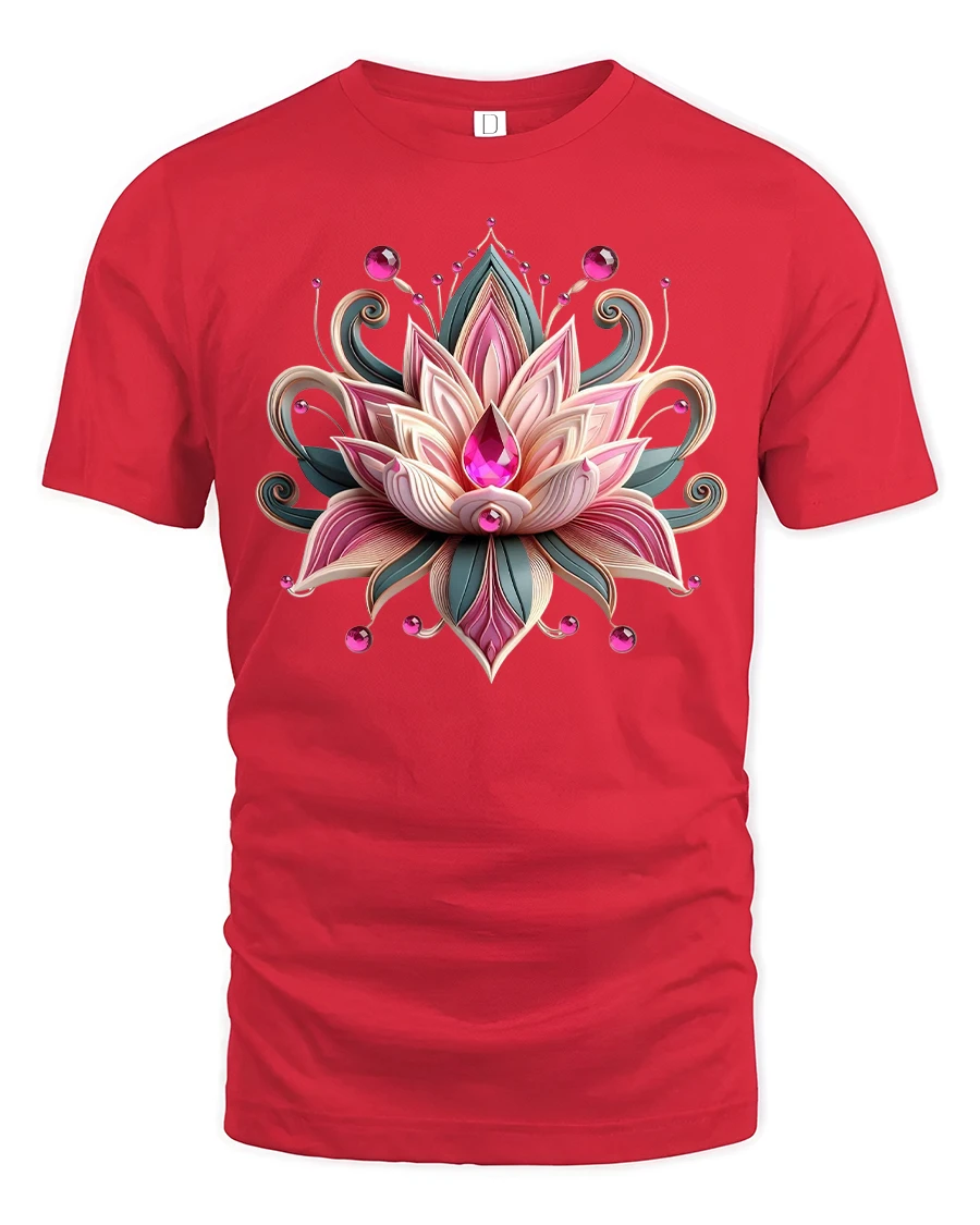 Elegant Lotus Jewel Art Graphic Tee With Beautiful Floral Design - red t-shirt on white background