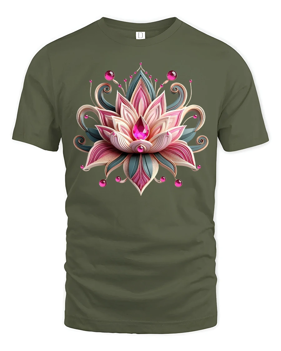Elegant Lotus Jewel Art Graphic Tee With Beautiful Floral Design - military green t-shirt on white background