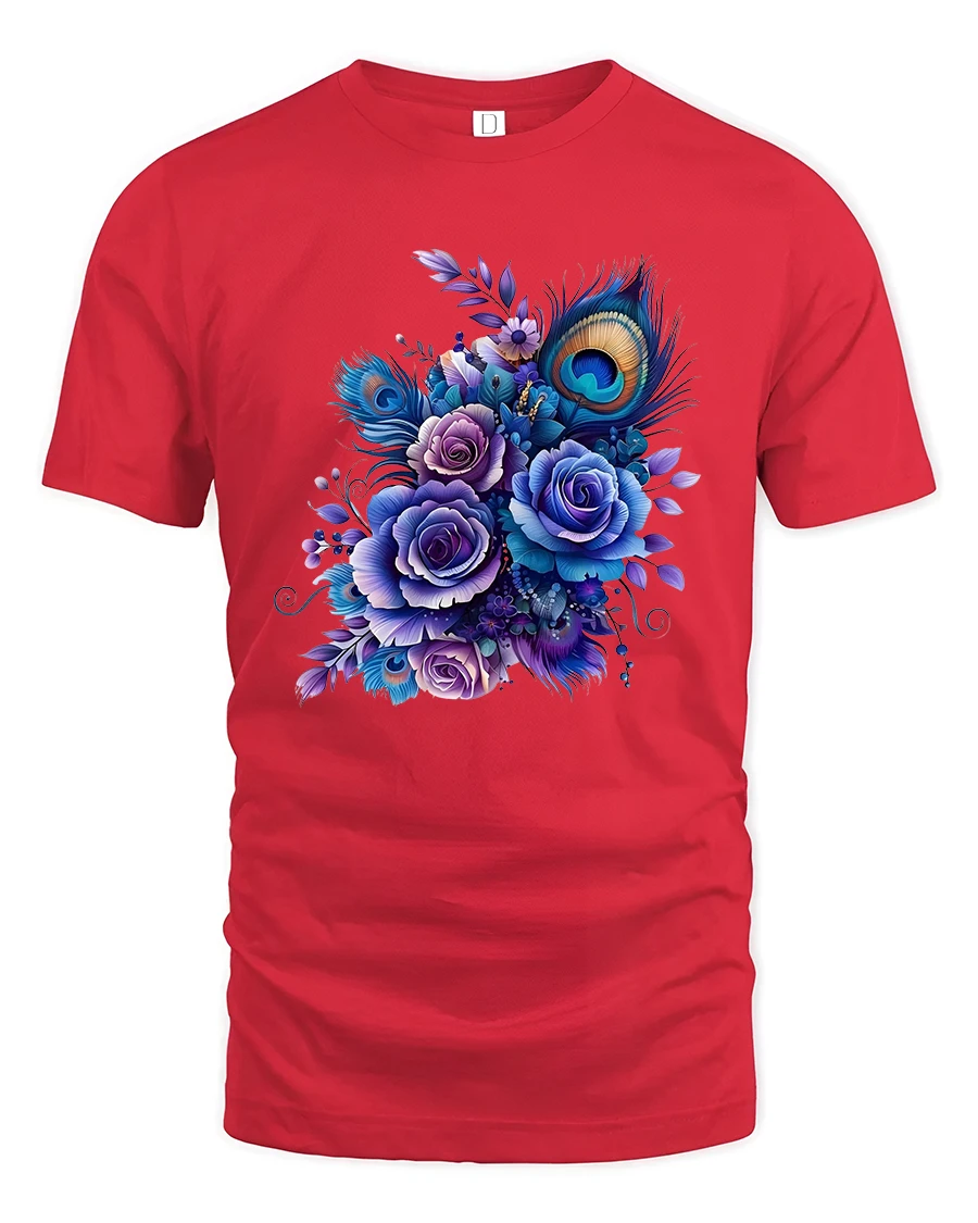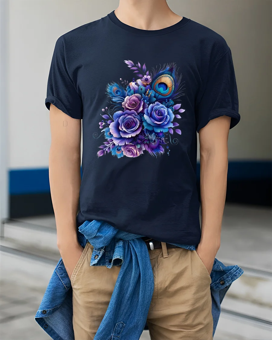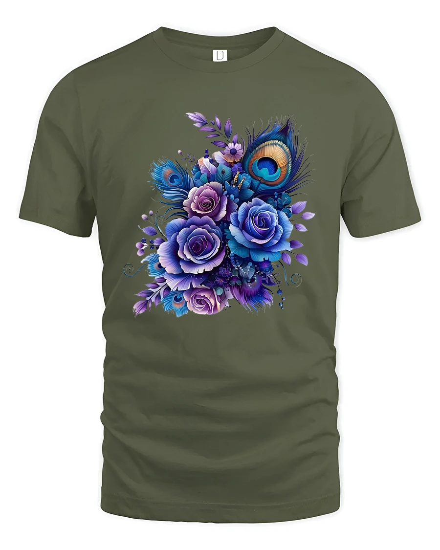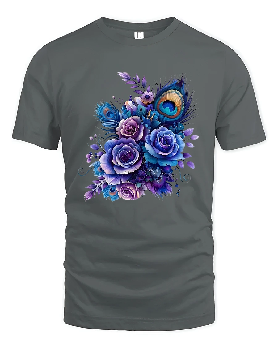 The Elegant Peacock Feather Floral Art Tee blends graceful beauty with rich artistic detail.