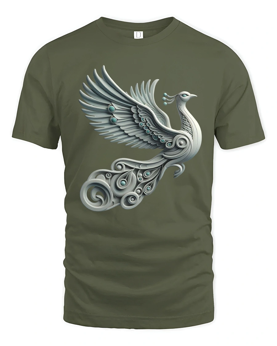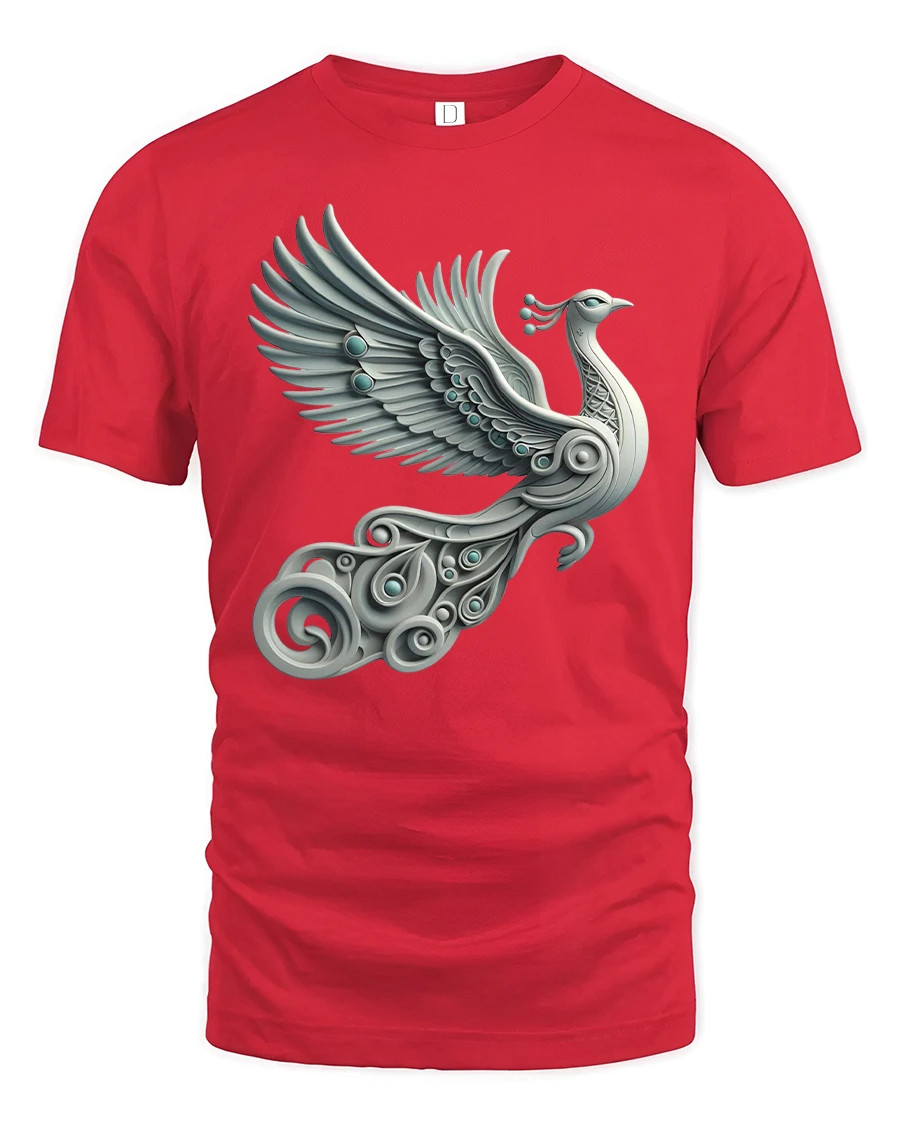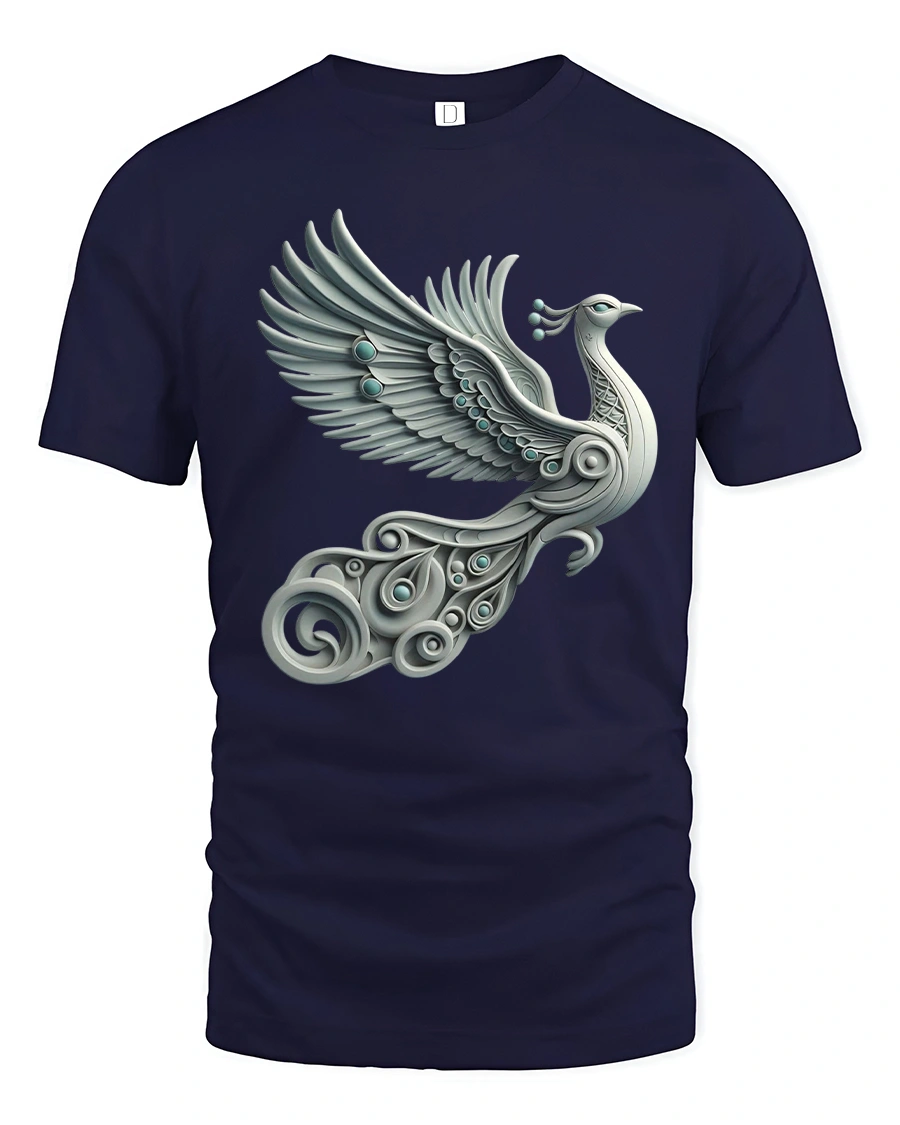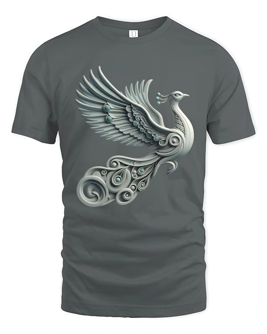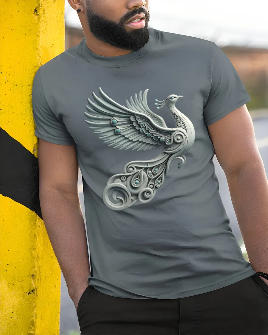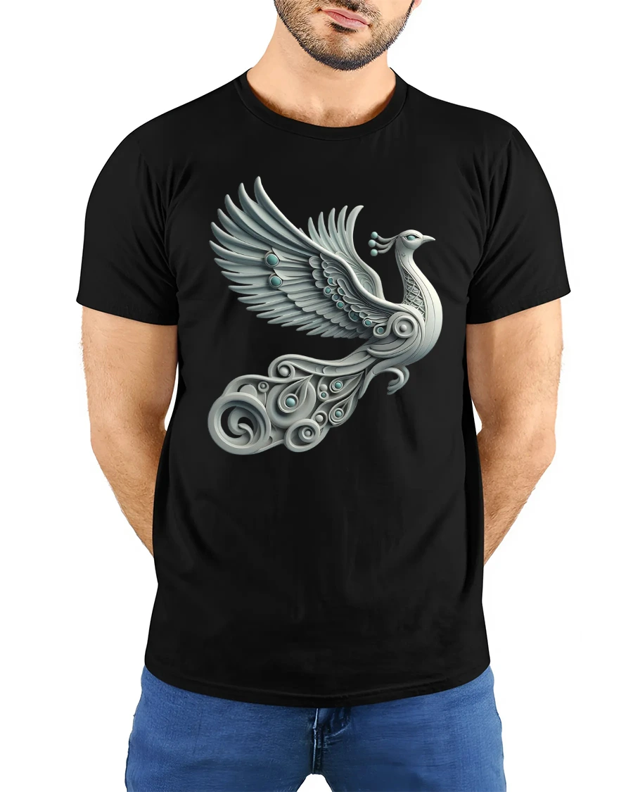 Elegant Silver Peacock Tee with Artistic Winged Bird Design brings beauty, motion, and style together in a stunning wearable artwork. This tshirt showcases a graceful silver peacock in mid-flight, designed with sweeping metallic feathers, ornamental details, and elegant swirling shapes that give the design a refined, artistic feel. The soft gradients and fluid lines create a sophisticated look that stands out while remaining versatile for everyday wear.