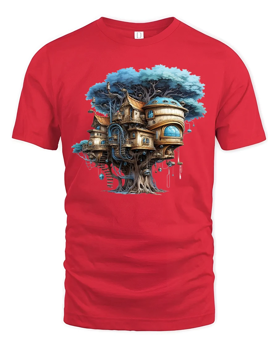 Enchanted Treehouse Fantasy Art Tee for Nature Lovers - red t-shirt on white background