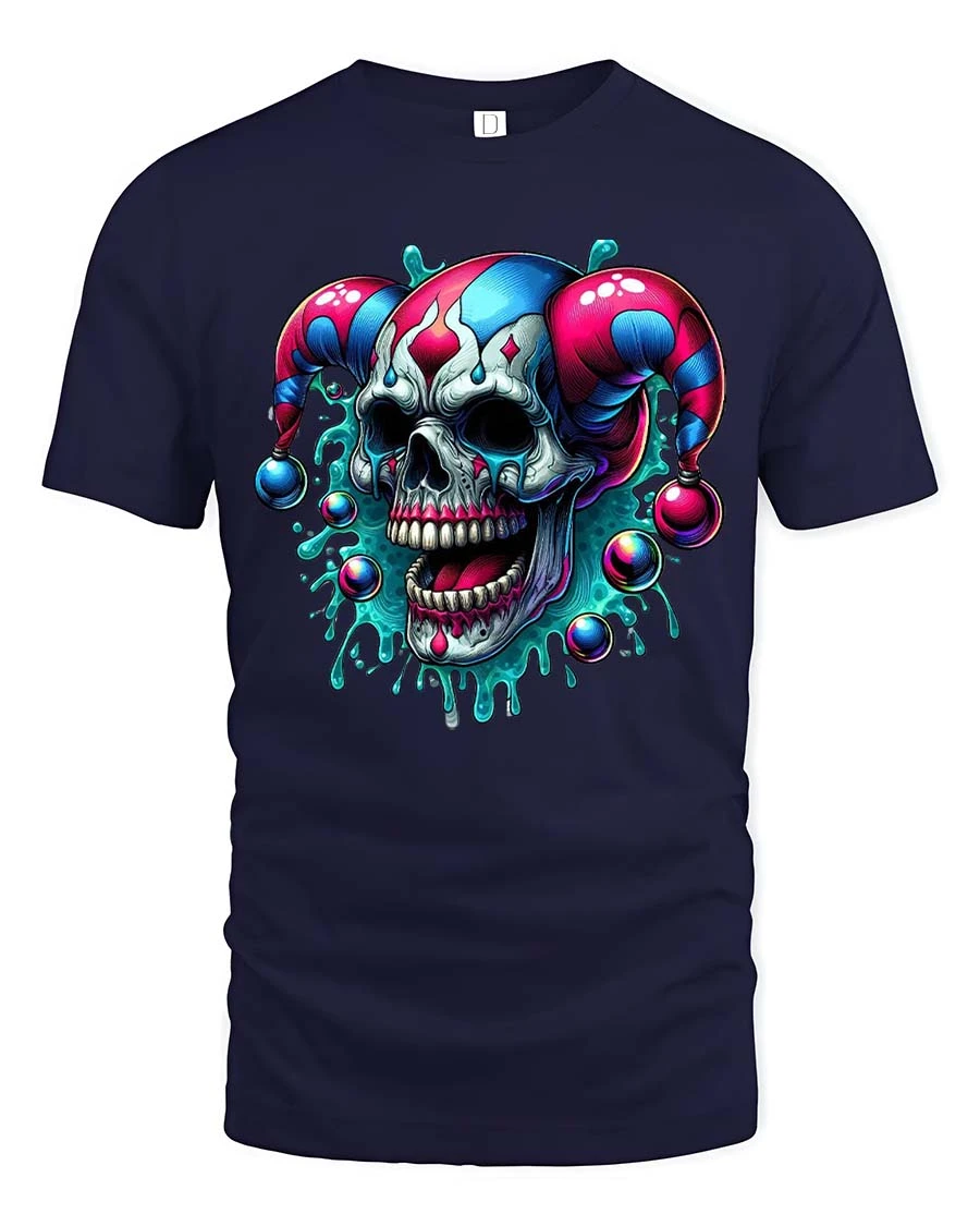 Evil Jester Skull T-Shirt Dark Clown Horror Graphic Tee - navy t-shirt on white background