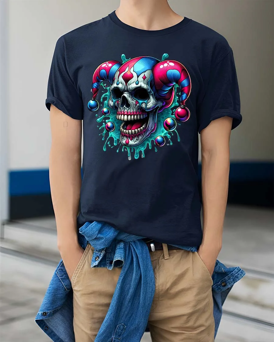 Evil Jester Skull T-Shirt Dark Clown Horror Graphic Tee - model wearing navy tee with hands in pockets