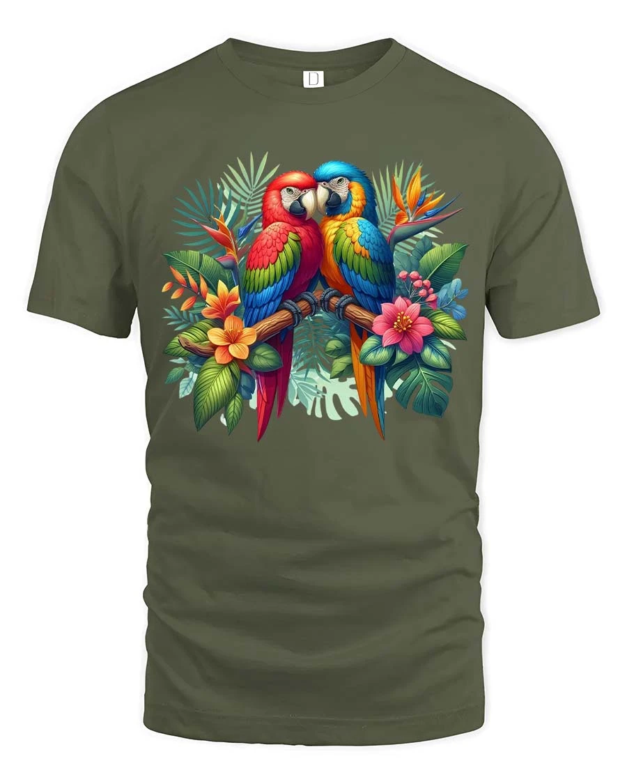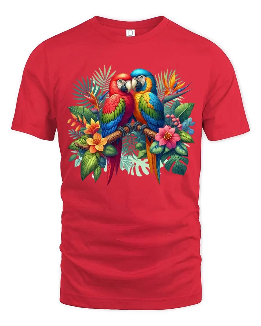 Exotic Macaw Birds T Shirt Colorful Nature Graphic Art Tee features a beautifully detailed pair of vibrant macaws perched together among lush tropical leaves and flowers.