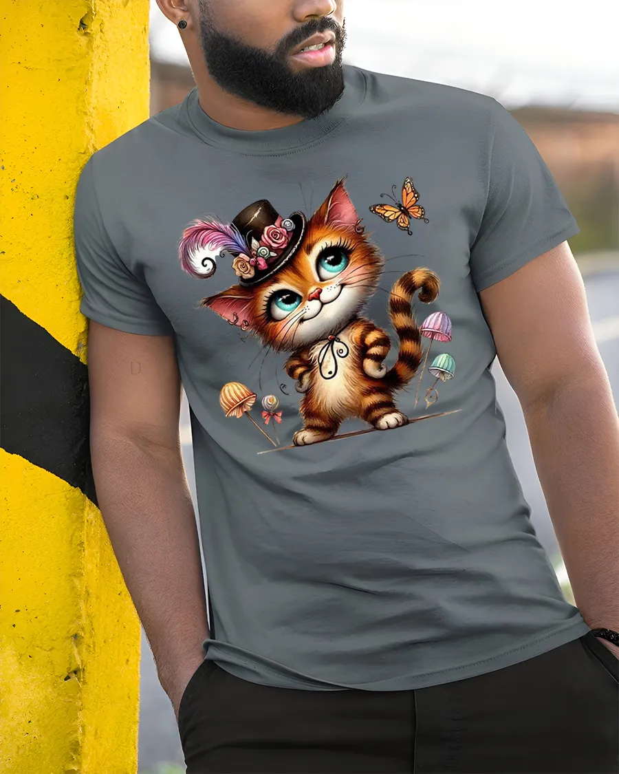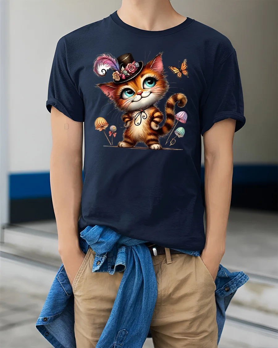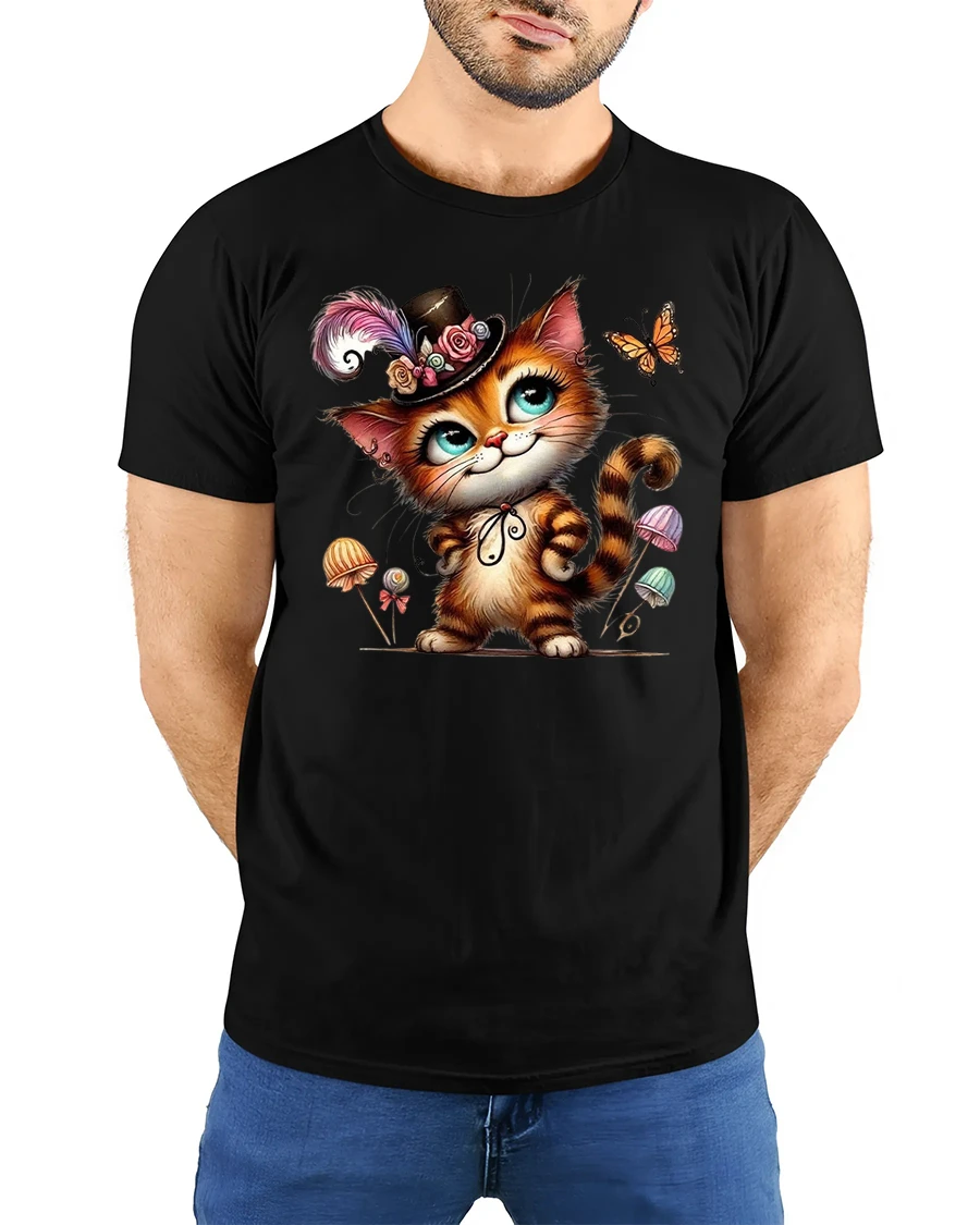 Featuring an adorable kitten wearing a stylish feather hat surrounded by butterflies and candies, this tee captures a playful and vintage-inspired aesthetic that brings joy to any outfit.
