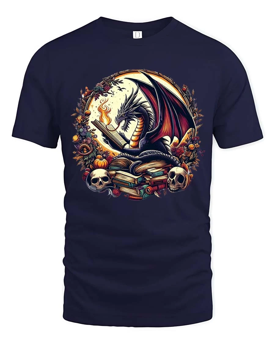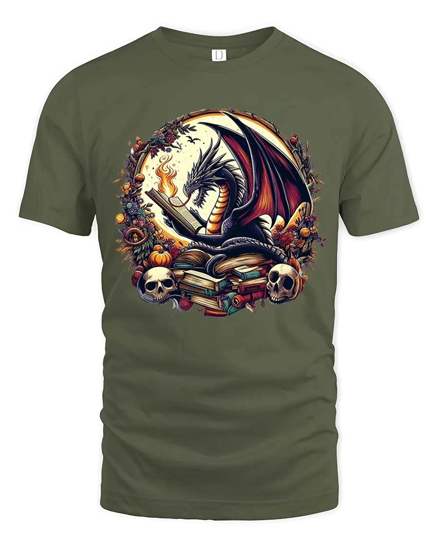 Fantasy Dragon Reading Books Graphic T Shirt Dark Magic Tee brings a rich and imaginative design inspired by fantasy worlds and mystical storytelling.