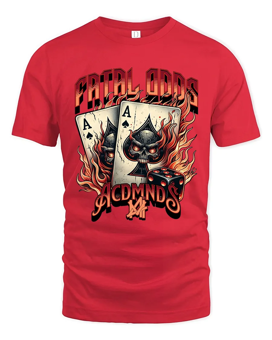 Fatal Odds Skull Ace Cards T Shirt Fiery Gambling Art delivers intense casino energy with a bold dark twist. This striking graphic tee features powerful ace cards with a fierce skull design surrounded by blazing flames and rolling dice. The dramatic artwork captures the thrill of high stakes action and fearless risk taking in a visually explosive style.