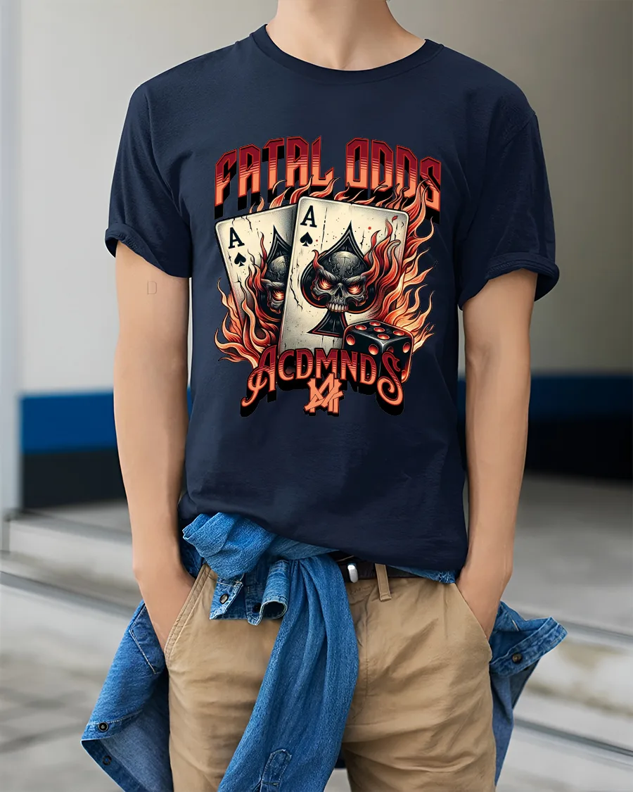 Crafted from soft breathable fabric, this tshirt offers all day comfort while showcasing a detailed high impact illustration. The combination of playing cards, fire elements, and sharp typography creates a confident statement piece that pairs effortlessly with jeans or layered streetwear looks. It reflects the daring mindset of those who live life on their own terms.