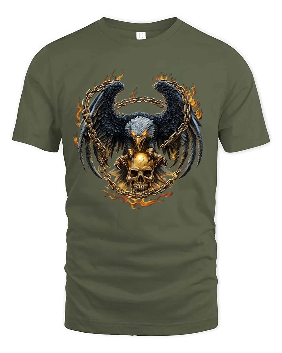 Fierce Eagle Skull Chain Flame Gothic Biker Graphic T Shirt - military green t-shirt on white background