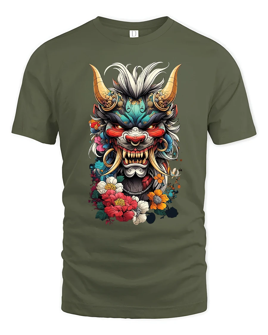 Fierce Oni Mask Floral Art Tee with Bold Japanese Style - military green t-shirt on white background