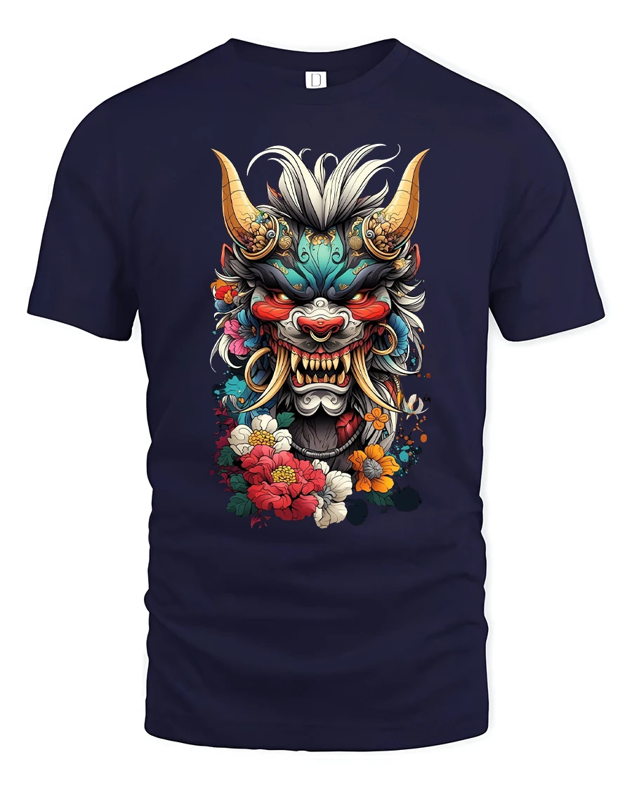 Fierce Oni Mask Floral Art Tee with Bold Japanese Style - navy t-shirt on white background