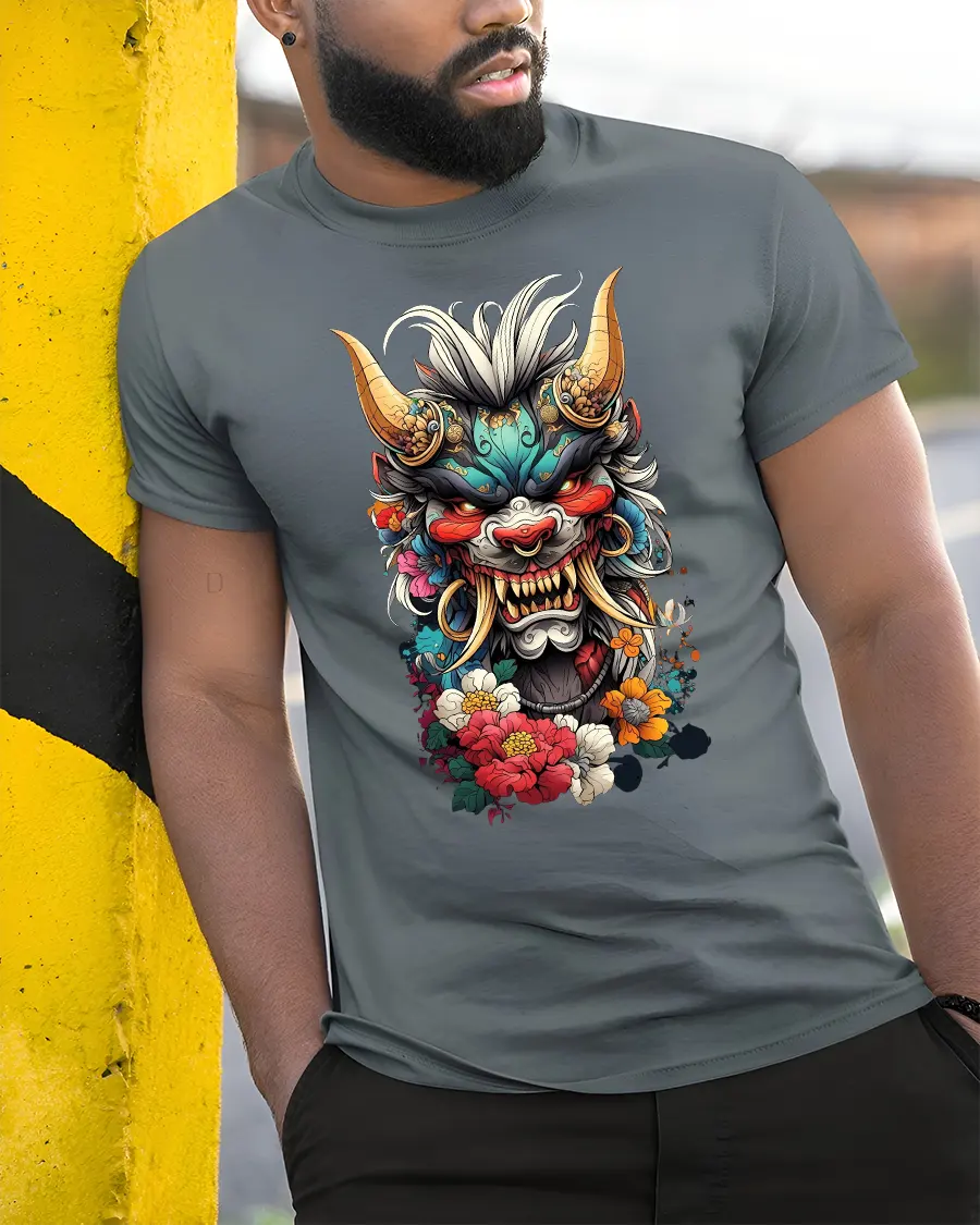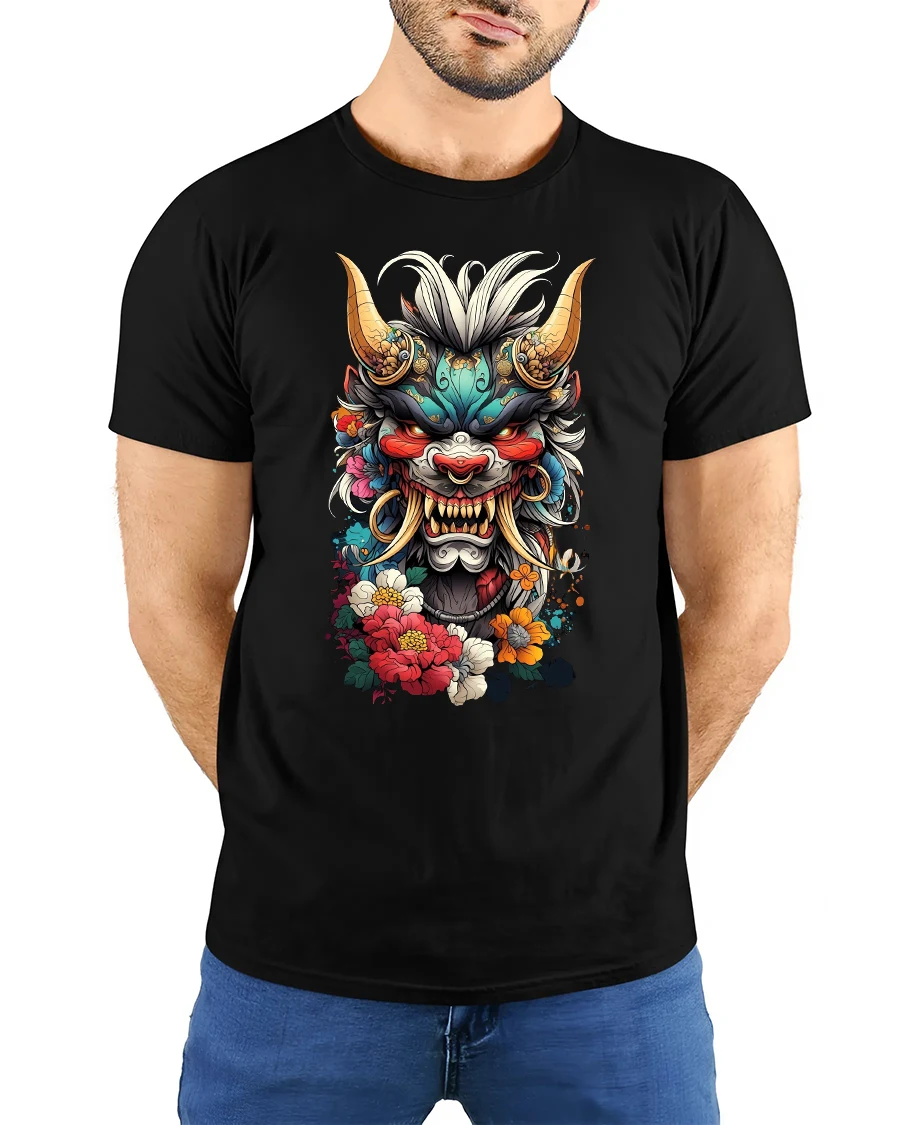 Fierce Oni Mask Floral Art Tee with Bold Japanese Style blends mythic power, vibrant color, and striking detail into a standout graphic tshirt that commands attention. The fierce oni mask is brought to life with sharp tusks, exaggerated horns, and glowing eyes, while the surrounding colorful flowers add a bold contrast that enhances the overall aesthetic. This dynamic mix of intensity and beauty creates a visually stunning look inspired by Japanese folklore and tattoo-style artwork.