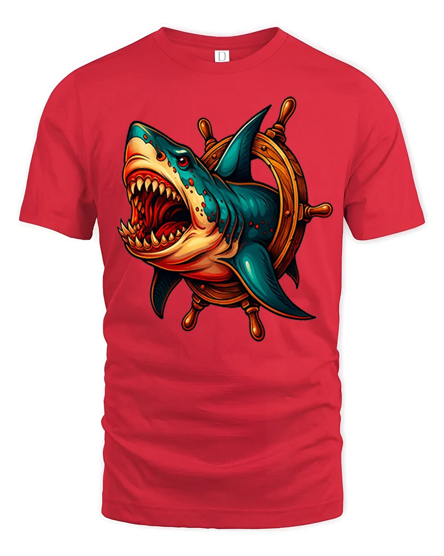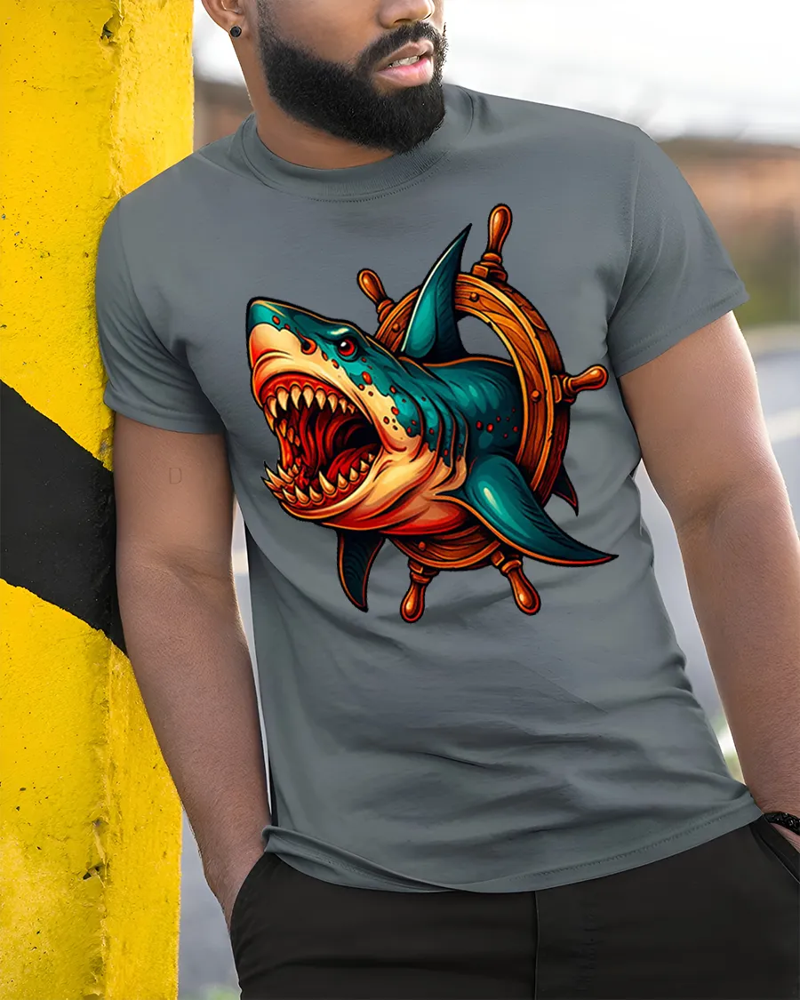 Fierce Shark Wheel Nautical Attack Graphic Tee unleashes bold ocean energy with a dramatic design featuring a roaring shark bursting through a wooden ship wheel. Its sharp teeth, intense expression, and striking color palette create a high-impact image perfect for fans of marine creatures, nautical themes, and powerful graphic art. The dynamic blend of ocean ferocity and pirate-inspired elements makes this tshirt a true standout piece.