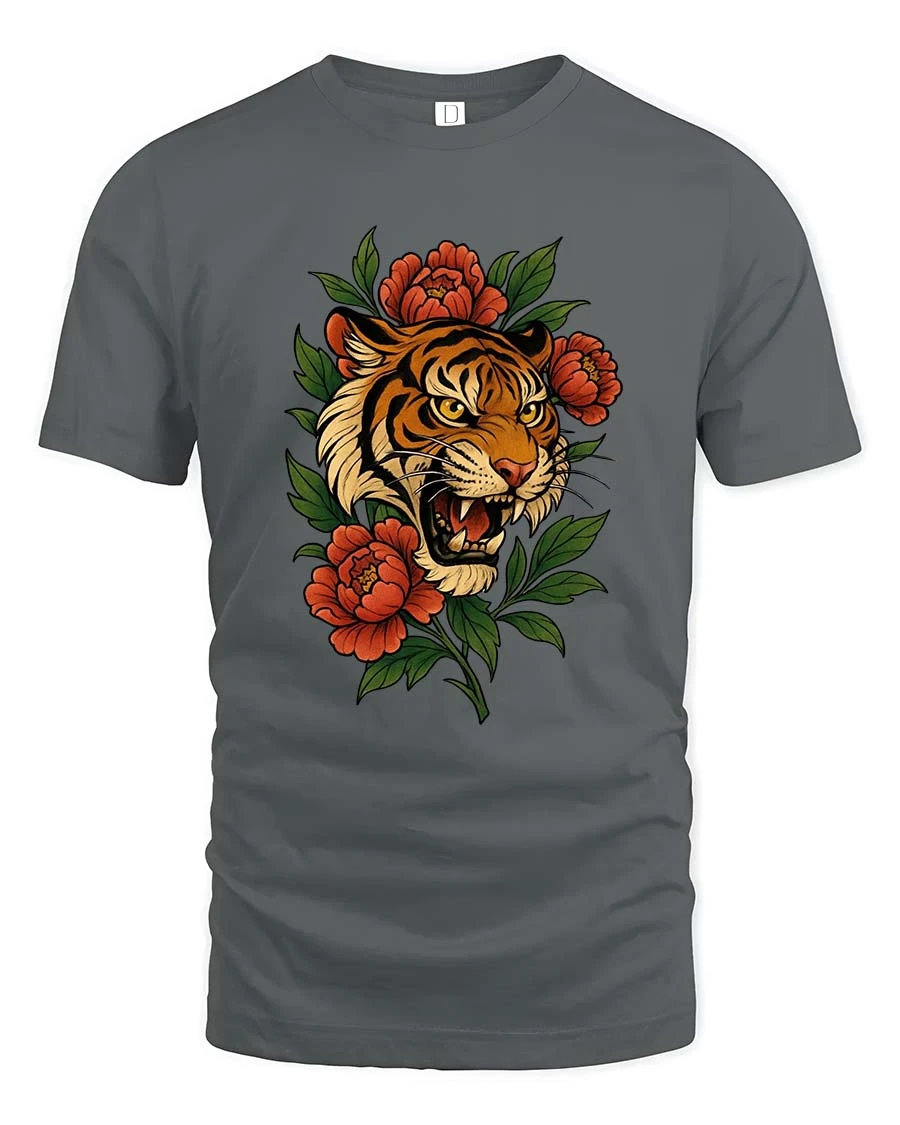 The Fierce Tiger Head With Flowers Wild Nature Graphic T Shirt stands out with its tattoo inspired illustration style and vibrant color palette.