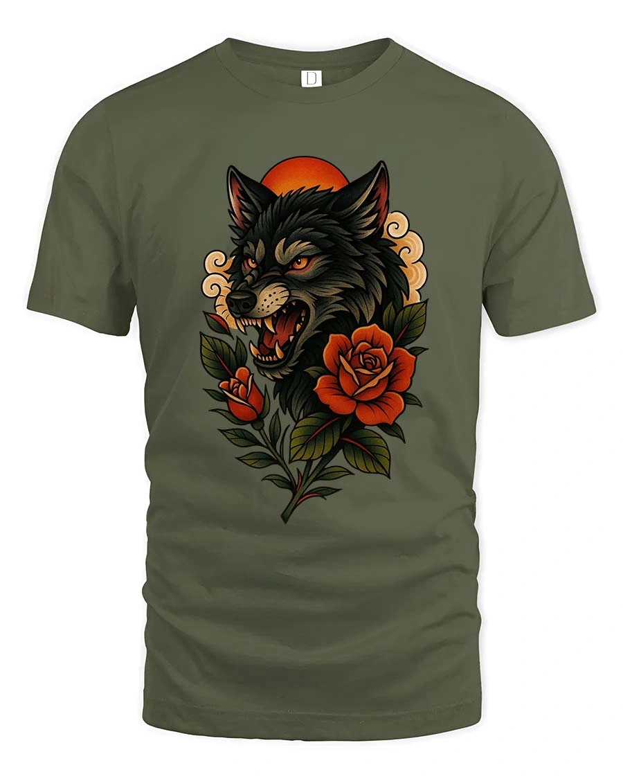 The Fierce Wolf Head With Roses Dark Nature Graphic T Shirt combines the strength and symbolism of the wolf with the timeless beauty of roses.