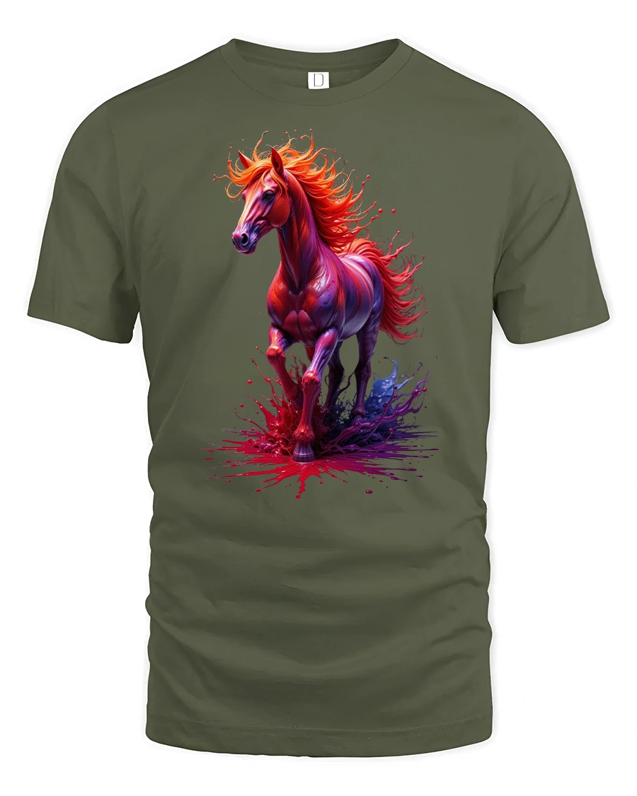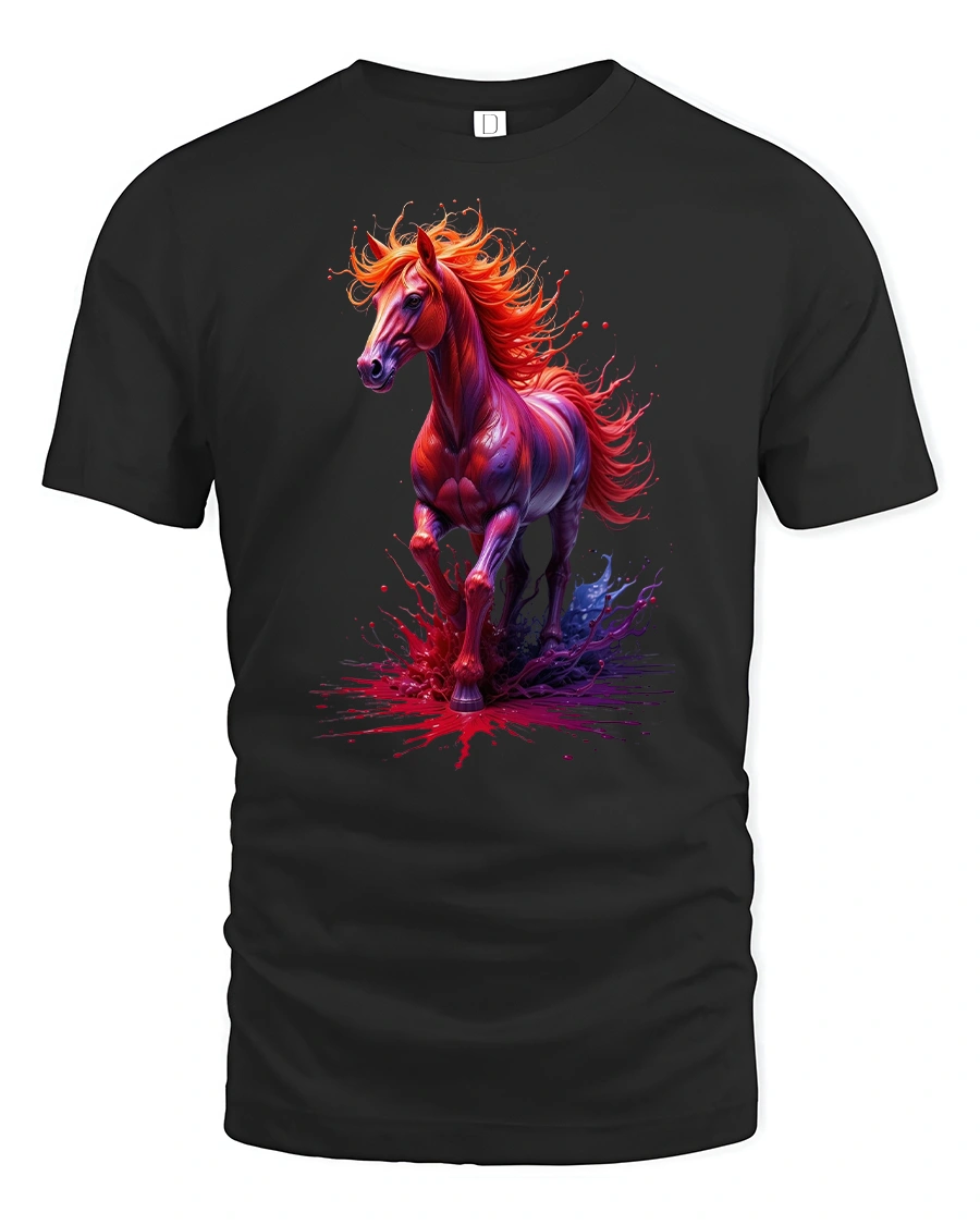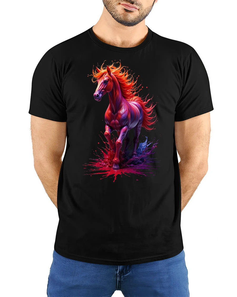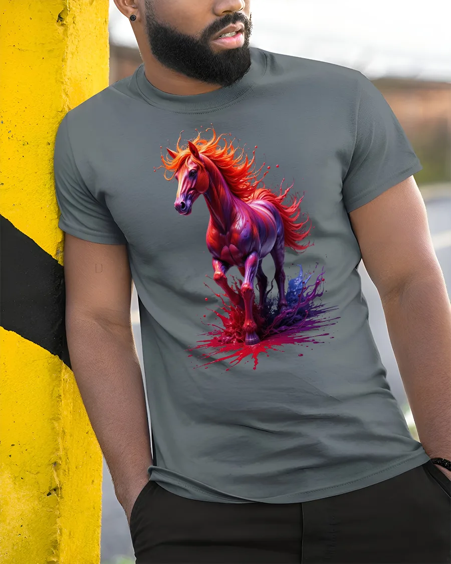 Ignite your wardrobe with the Fiery Spirit Horse Splash Art Graphic Print T-Shirt, a bold design that captures the raw energy and elegance of a galloping stallion. With its vivid splash of fiery reds and purples, this tee symbolizes freedom, strength, and passion in every detail.