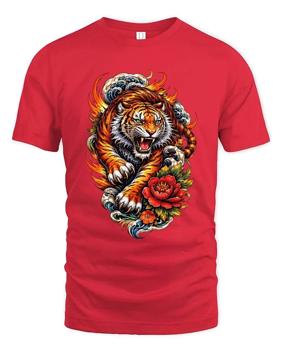 Fiery Tiger Tshirt Japanese Wave Floral Tattoo Style Graphic captures the raw power and beauty of a roaring tiger in motion.