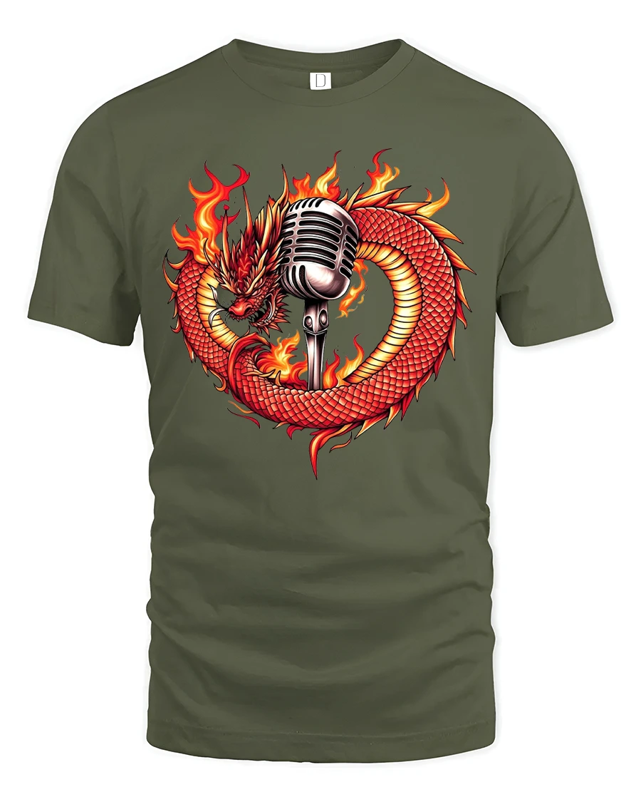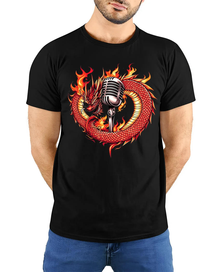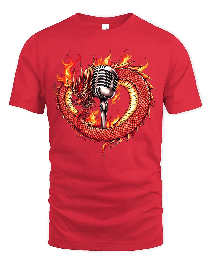 Featuring a fierce red dragon wrapped around a vintage microphone surrounded by blazing flames, this shirt symbolizes raw energy, creativity, and power.