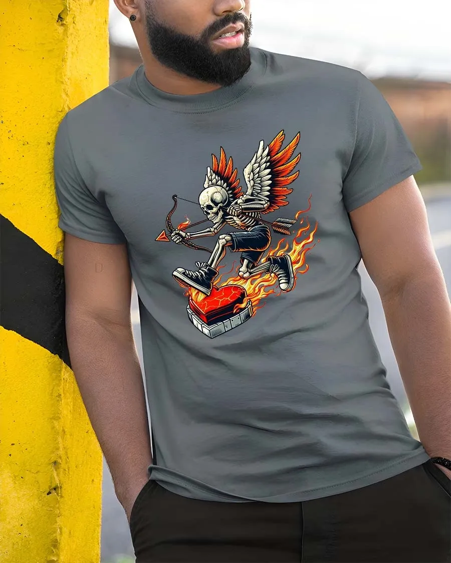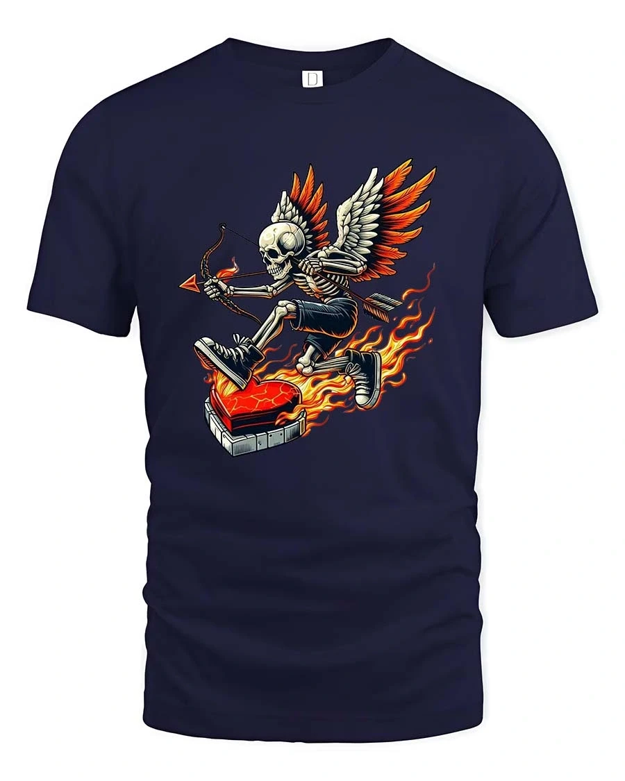 The Flaming Cupid Skeleton Graphic T Shirt delivers a bold twist on classic romance with a winged skeleton archer aiming a fiery arrow at a blazing heart. The dramatic flames, detailed wings, and dynamic pose create an eye catching design that blends love, rebellion, and edgy street style. This striking artwork turns a traditional symbol into a fearless statement full of attitude and personality.