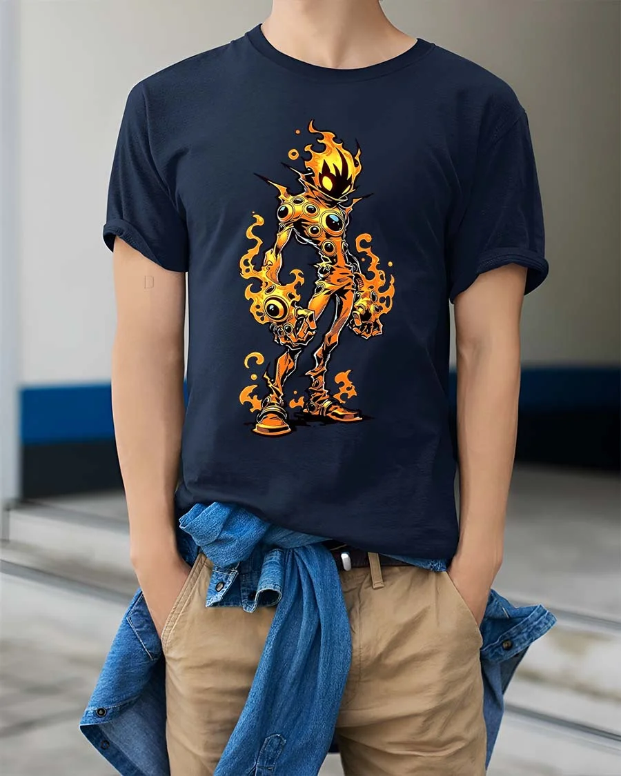 Flaming Monster T Shirt Creepy Fire Creature Graphic Tee - model wearing navy tee with hands in pockets