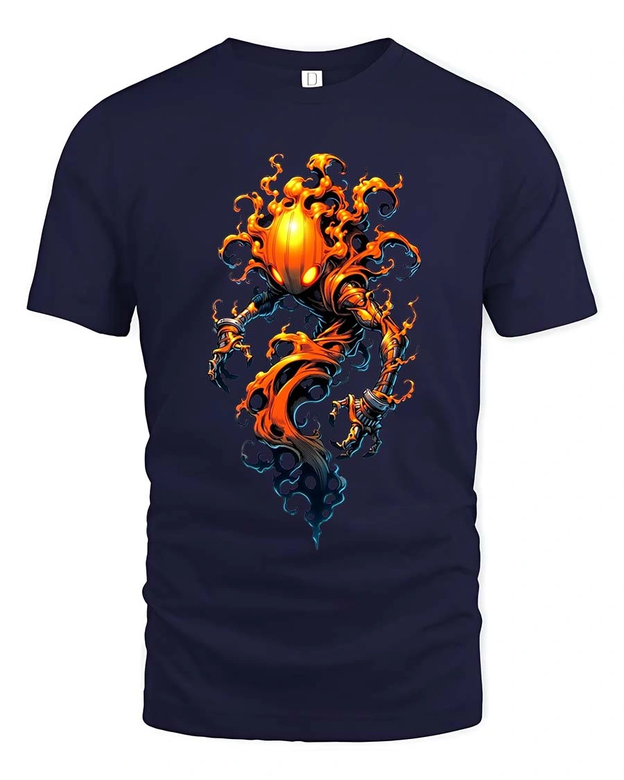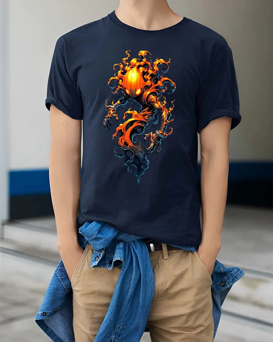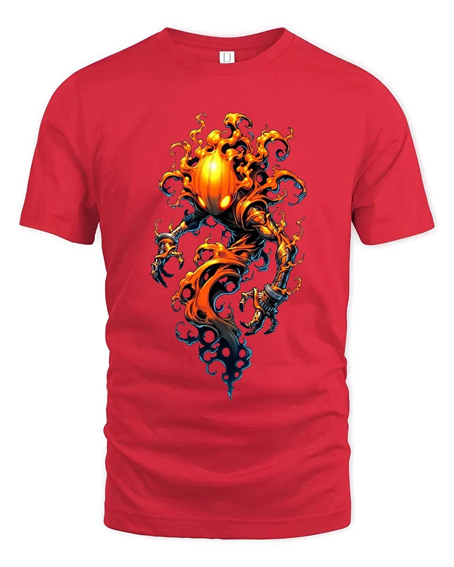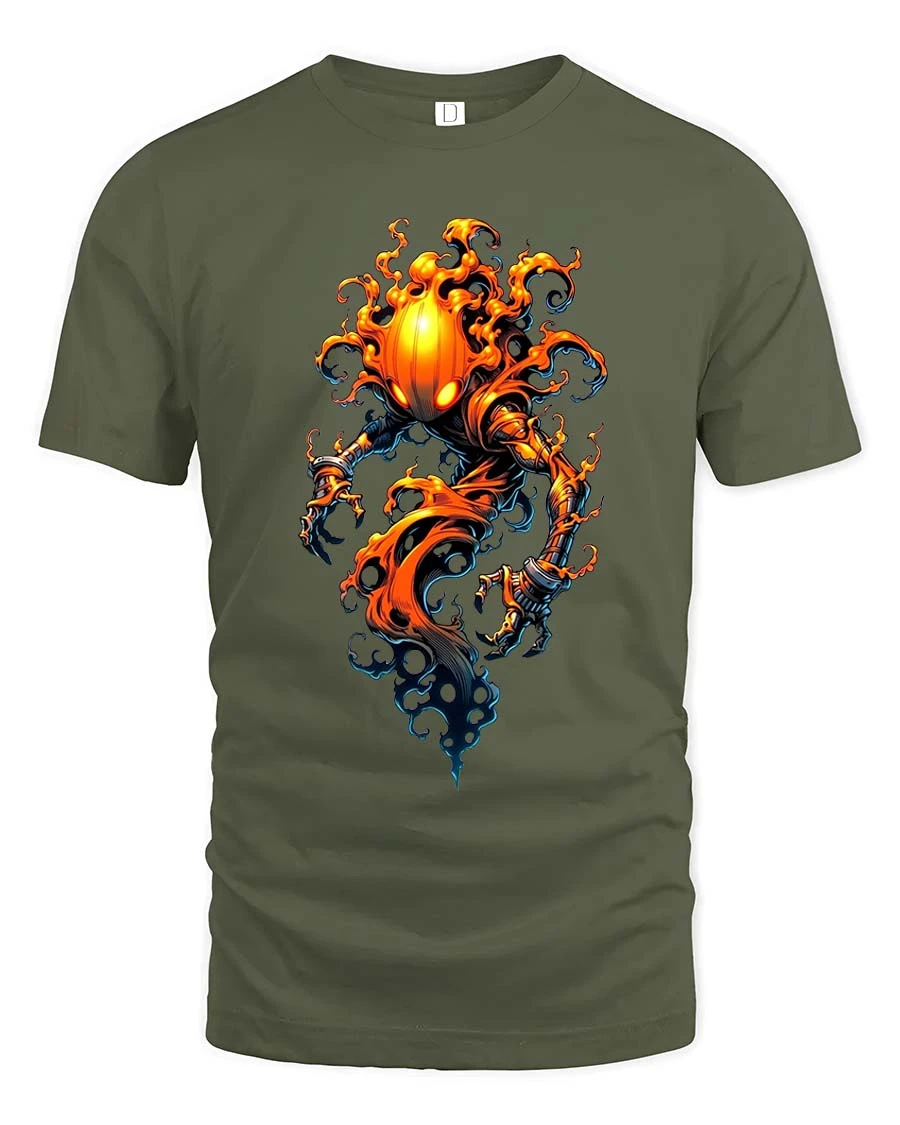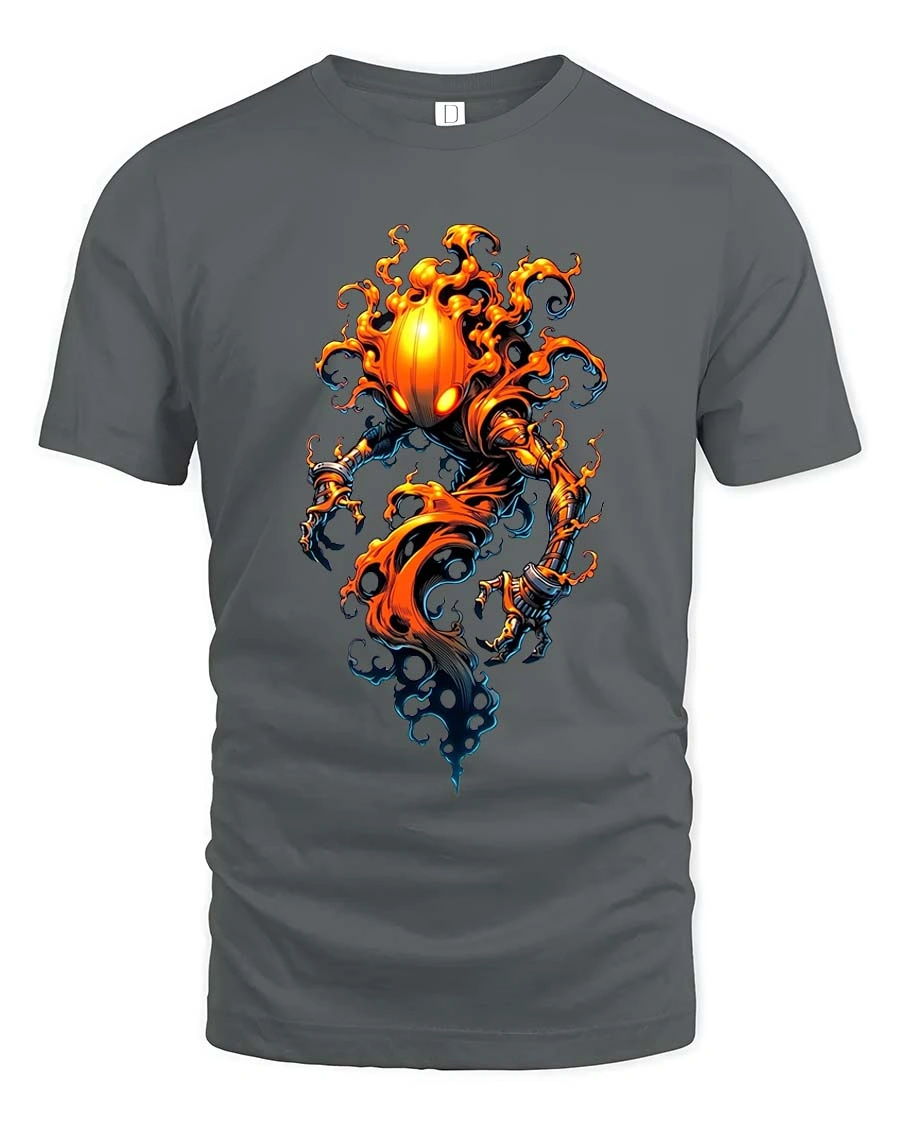 Featuring a glowing pumpkin creature surrounded by swirling flames and shadowy details, this graphic tshirt creates a dramatic and eye catching look that captures the essence of dark fantasy.