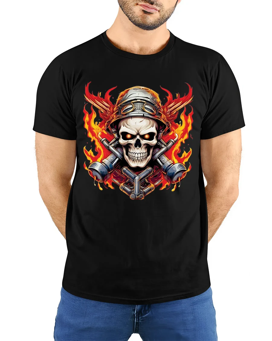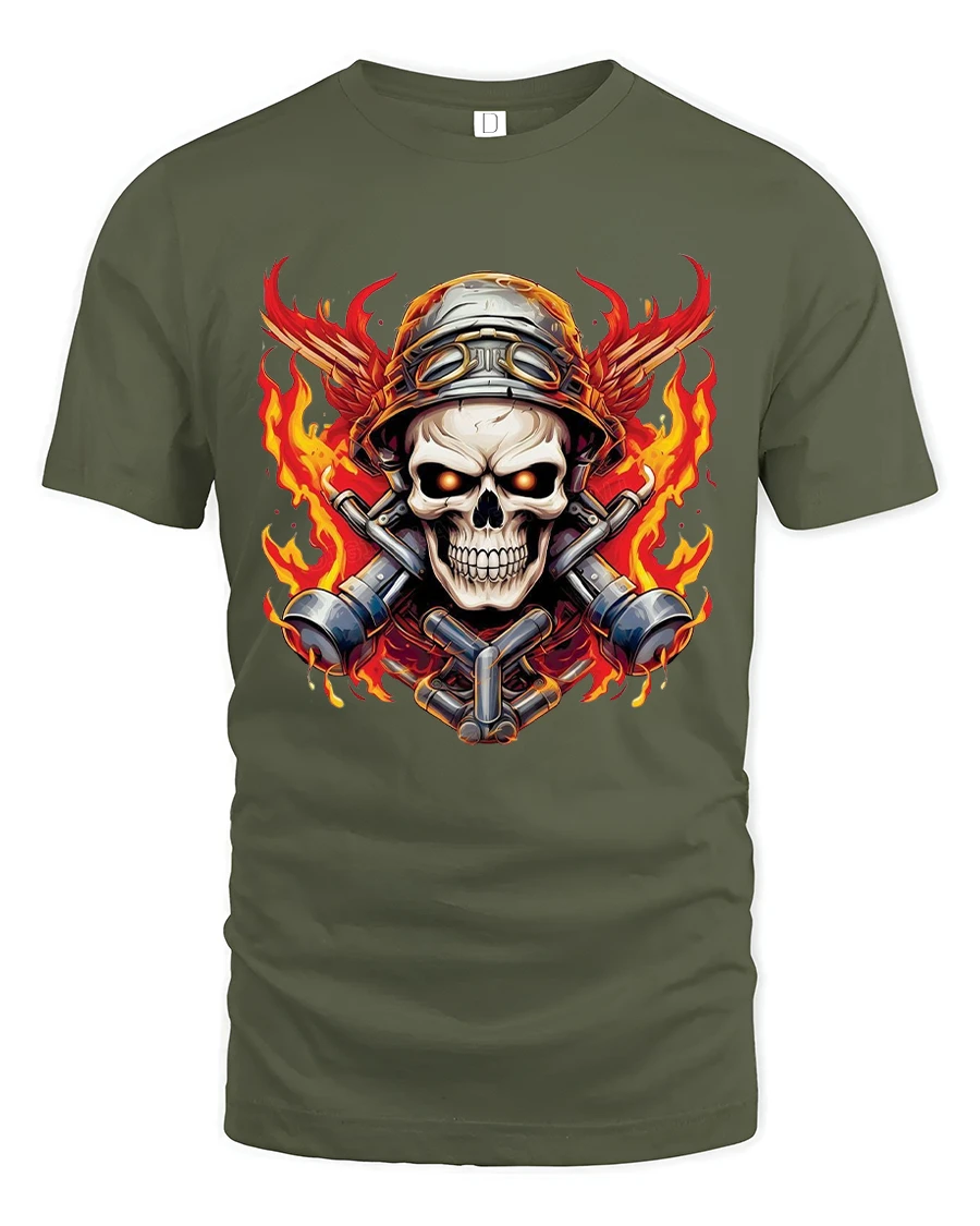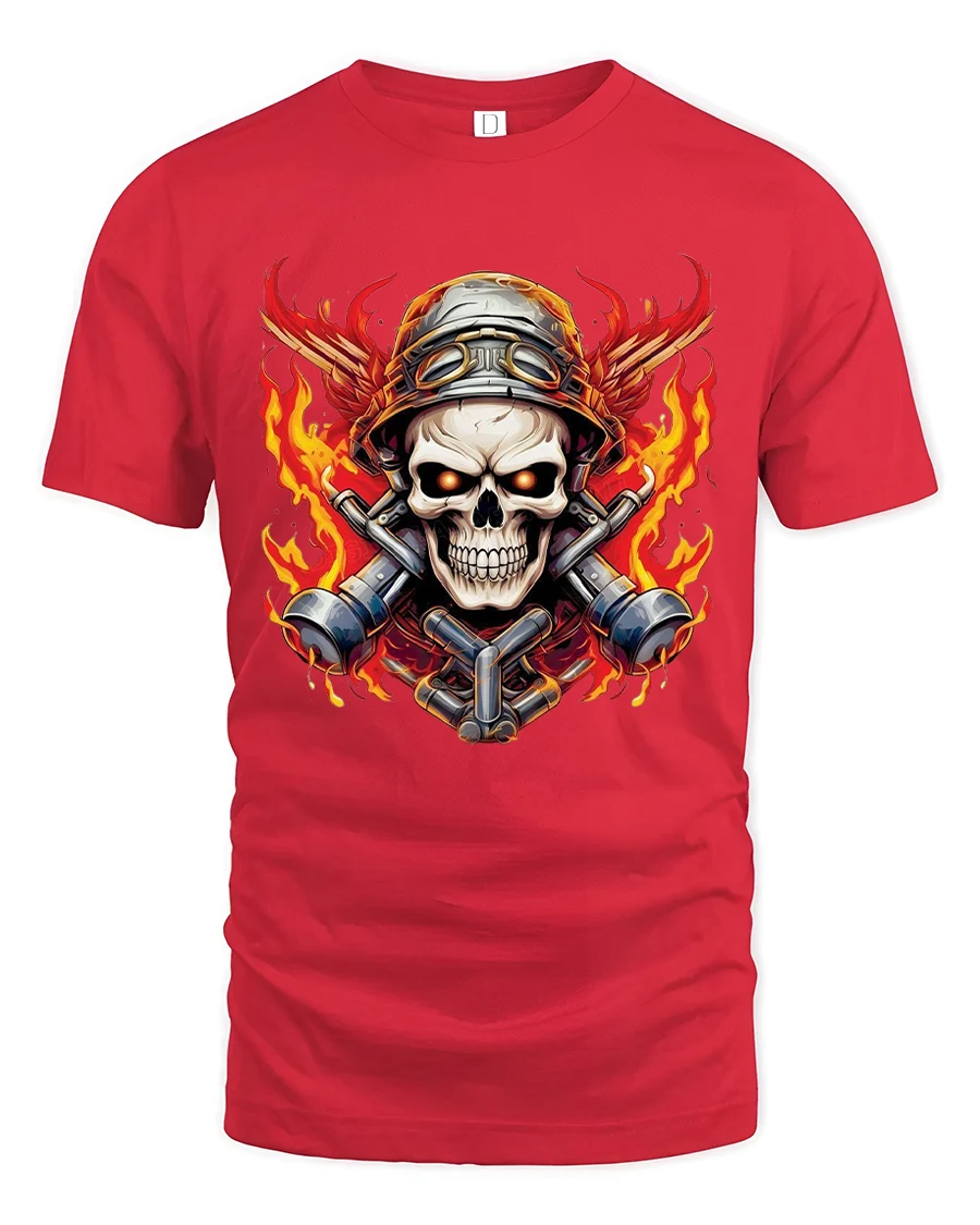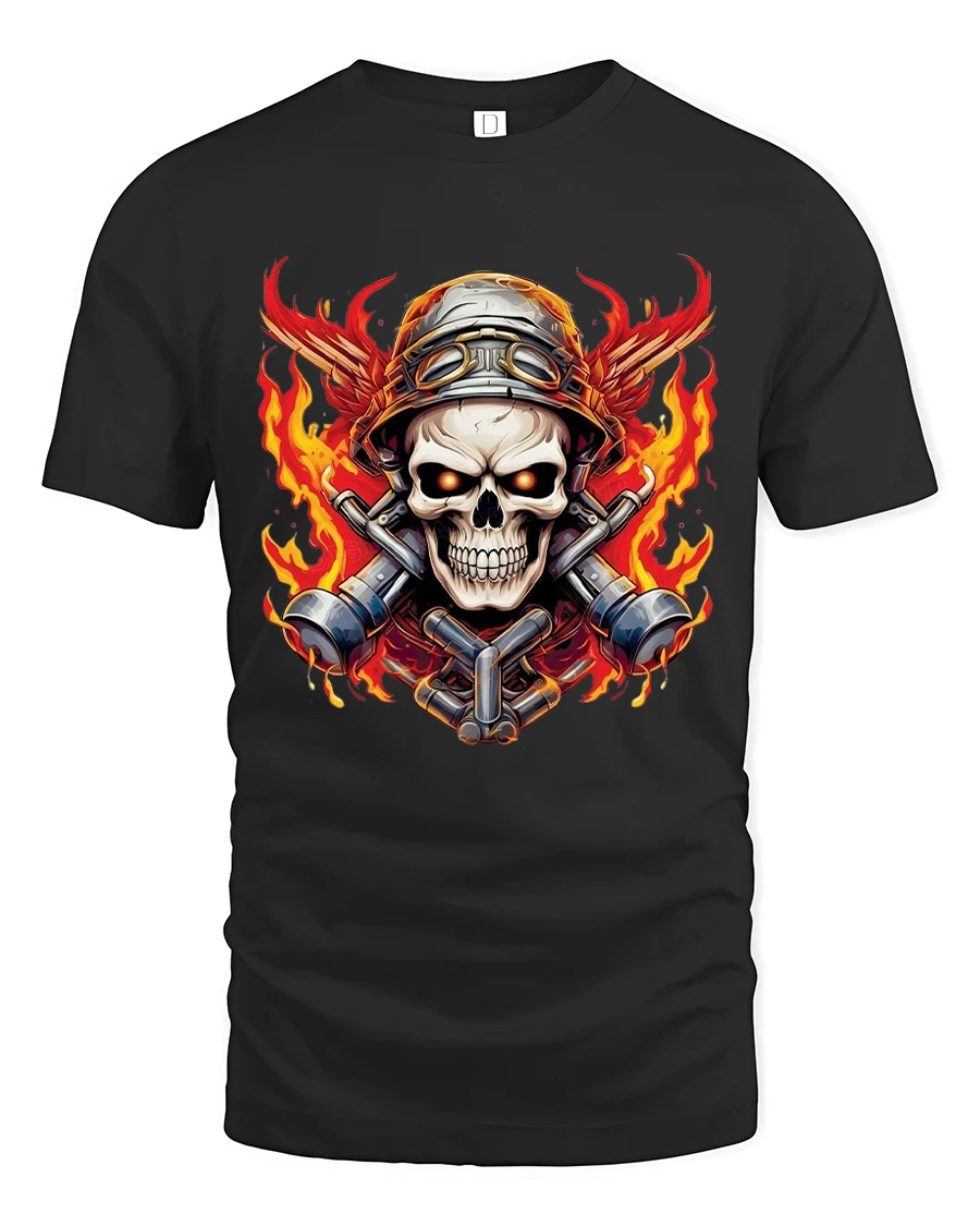The Flaming Skull Mechanic Warrior Graphic T Shirt With Bold Fire Art delivers an intense and powerful visual inspired by strength and rebellion.