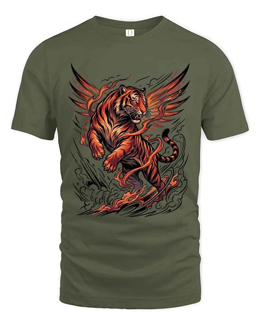 Flaming Winged Tiger T Shirt Fierce Fire Beast Graphic - military green t-shirt on white background