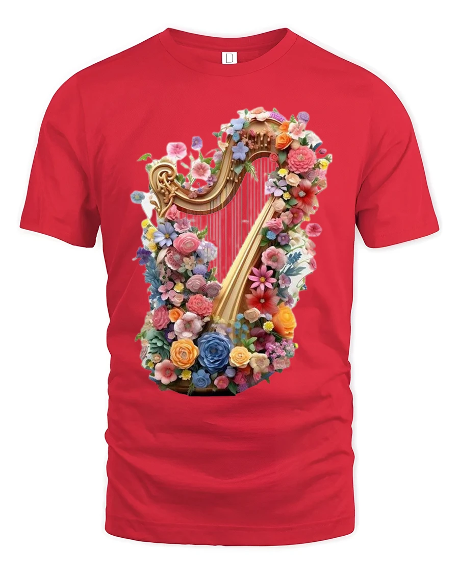 Floral Harp Magic Tee - Colorful Harp T-Shirt for Music Lovers - red t-shirt on white background