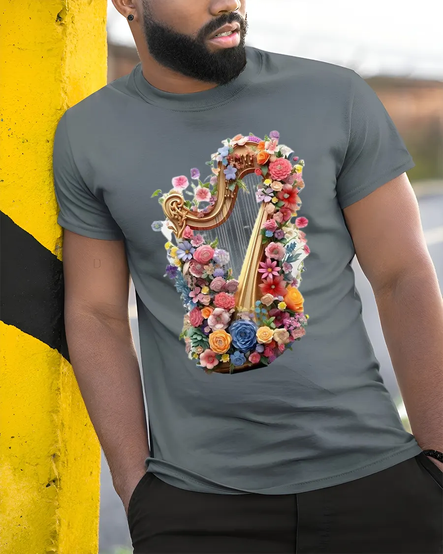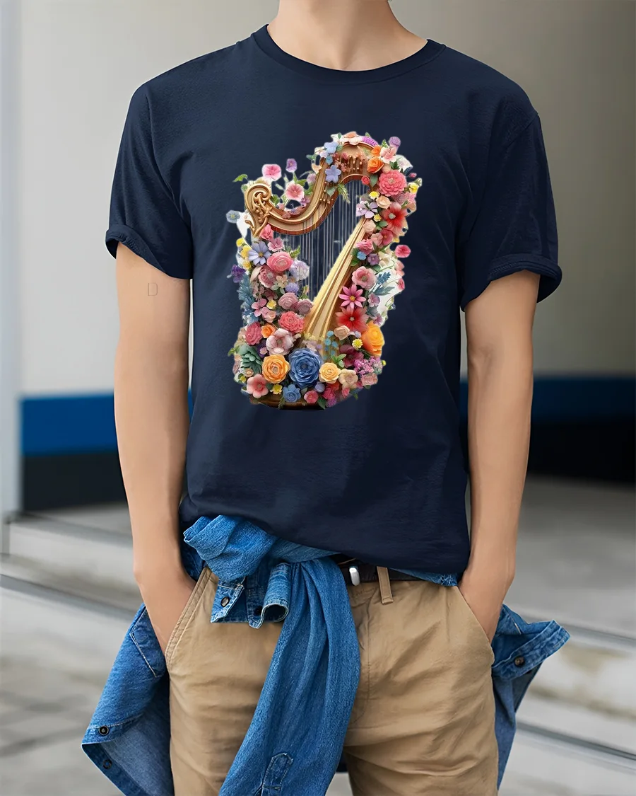 The Floral Harp Magic Tee is designed for comfort and style, making it ideal for concerts, casual outings, music festivals, or relaxing weekends. Its intricate print blends delicate roses, daisies, and blooming florals with the graceful curves of a classical harp, creating a detailed artwork that stands out from every angle.