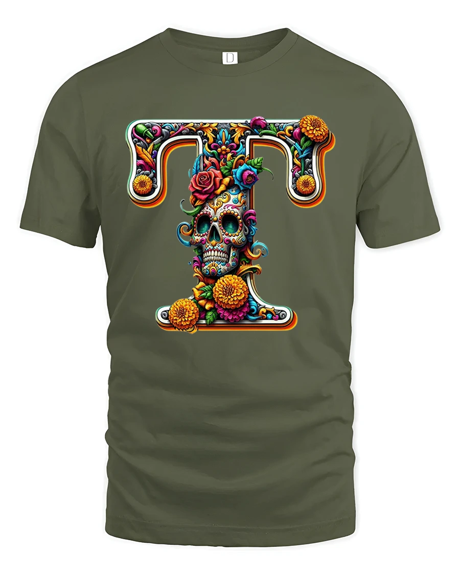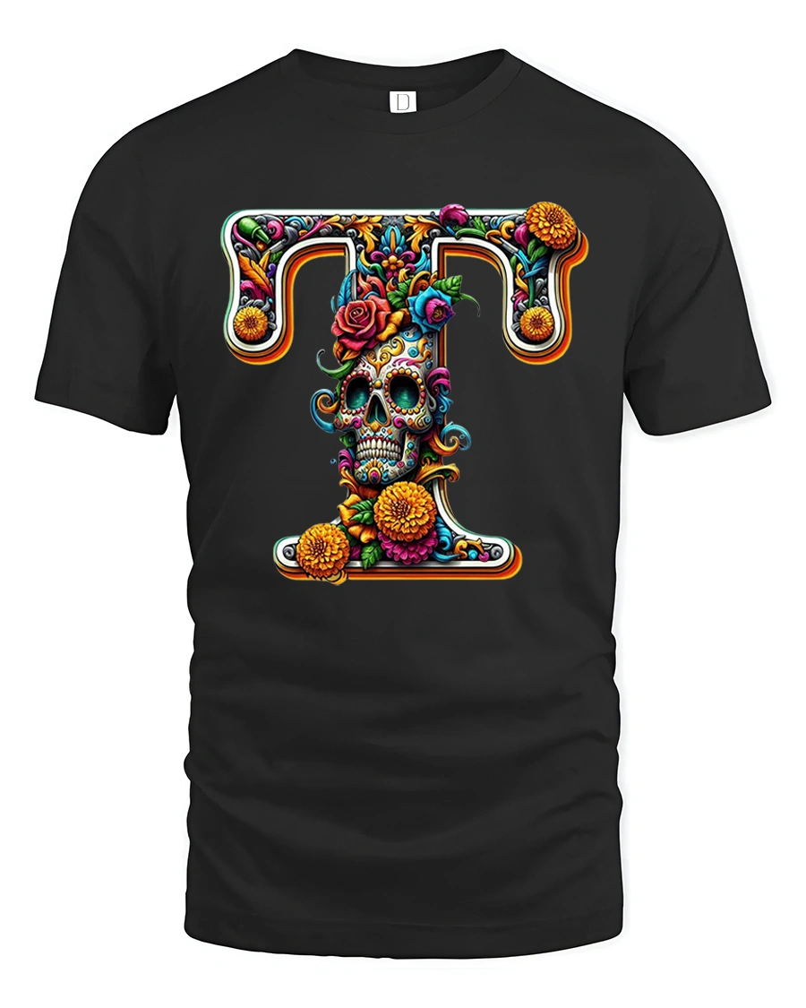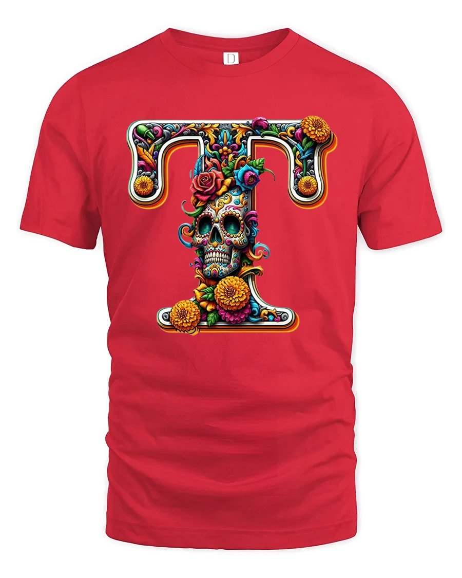 Floral Skull Letter T Decorative Art Graphic Tee blends bold artistic expression with vibrant Day-of-the-Dead style design. Featuring an ornate letter T filled with colorful flowers, intricate patterns, and a beautifully detailed sugar-skull motif, this tshirt makes a statement that is both edgy and artistic. The bright reds, yellows, greens, and blues pop against the design’s sharp outlines, creating a unique monogram look that stands out instantly.