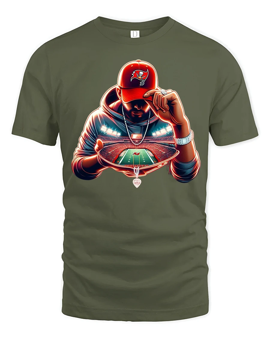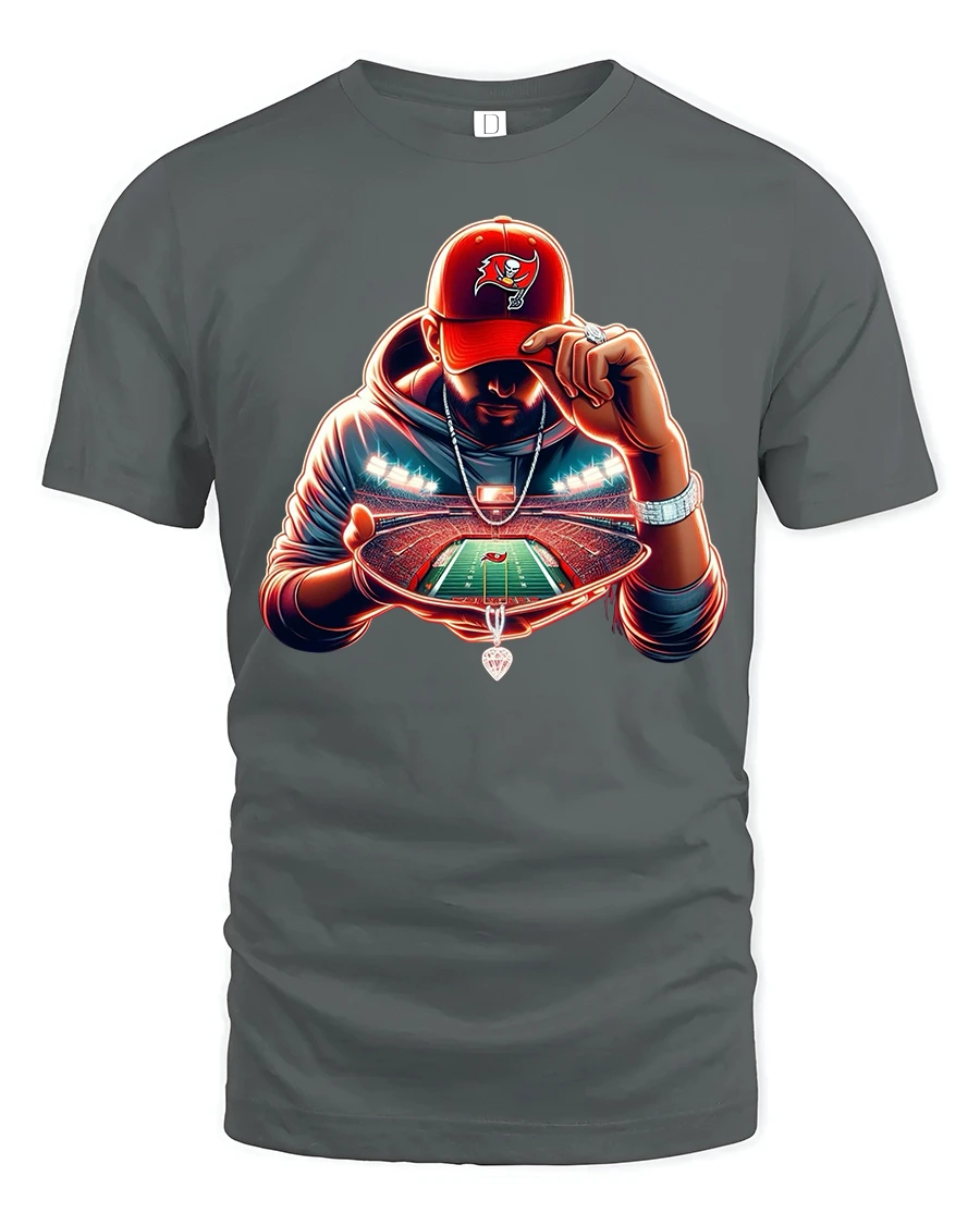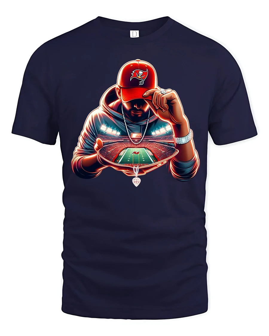 The design features a dramatic glowing stadium held in the hands of a mysterious football fan, creating a powerful and modern visual effect. The vivid lighting, detailed field illustration, and bold color accents make this tshirt perfect for football enthusiasts, game day outfits, and sports lovers who enjoy standout graphic apparel.
