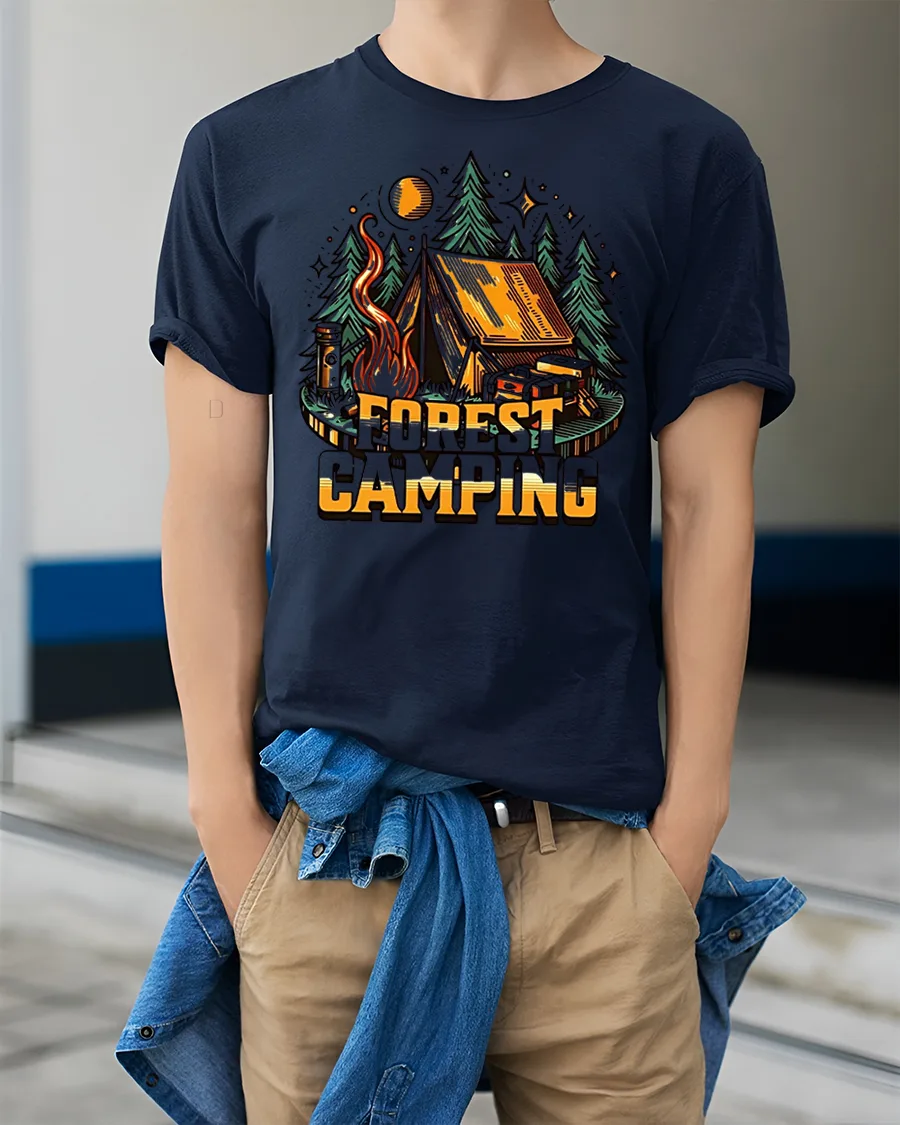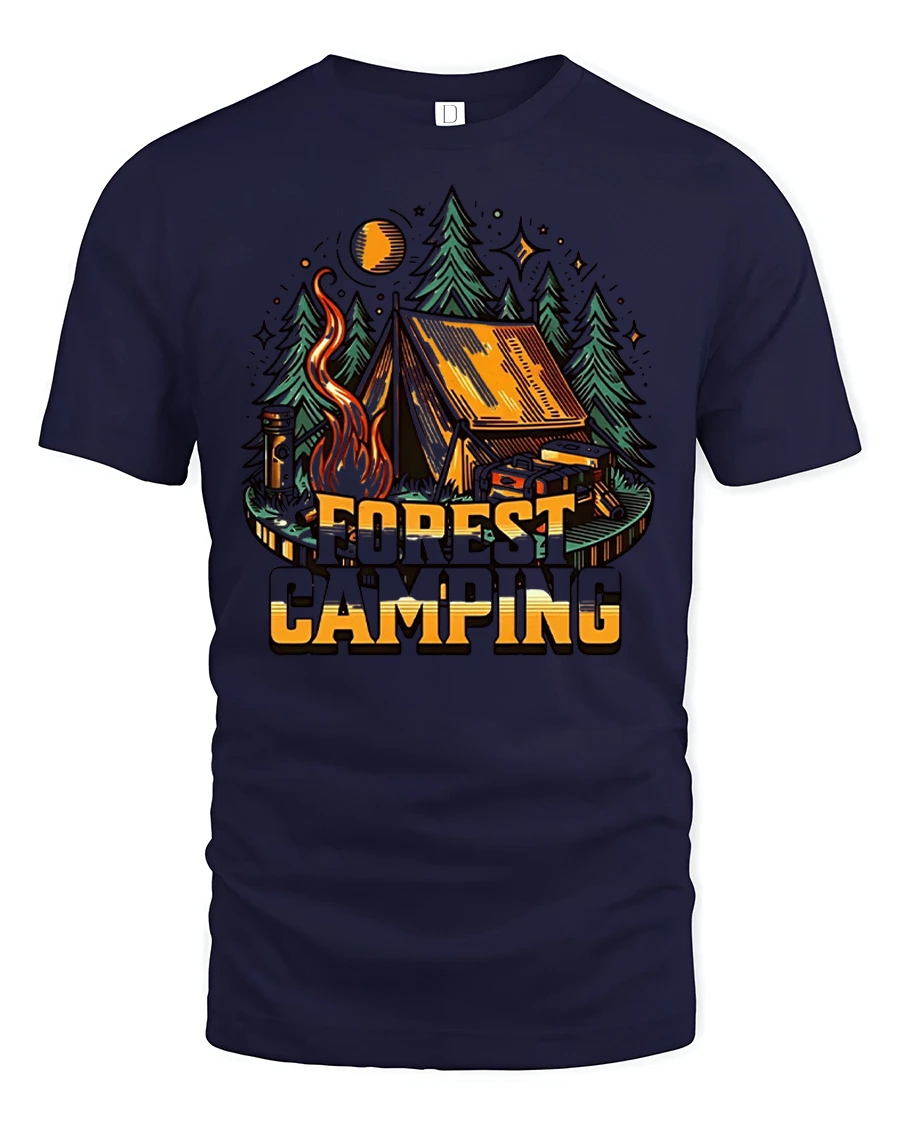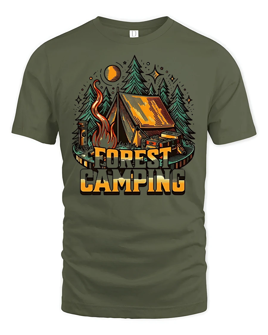 Forest Camping Adventure Graphic Tee With Rustic Outdoor Style brings the warm and nostalgic feeling of a night under the pines straight into your wardrobe. Featuring a detailed tent scene surrounded by tall evergreens, glowing firelight, and a peaceful moonlit sky, this tee captures the magic of escaping into nature. The retro colors and hand-drawn style make the design both bold and comforting, perfect for anyone who loves the outdoors. Crafted with soft material and quality printing, it offers lasting comfort along with eye catching artwork.