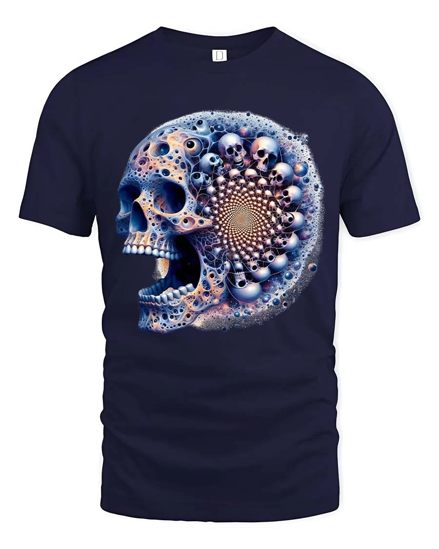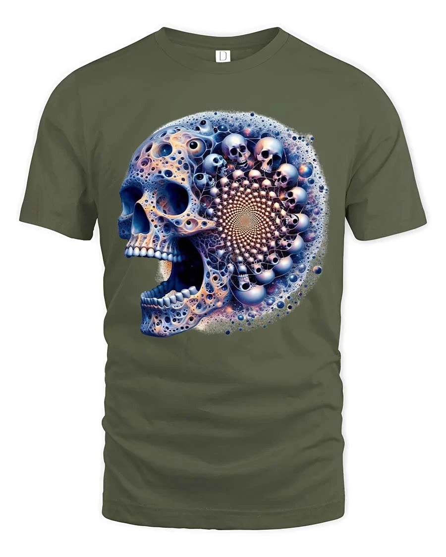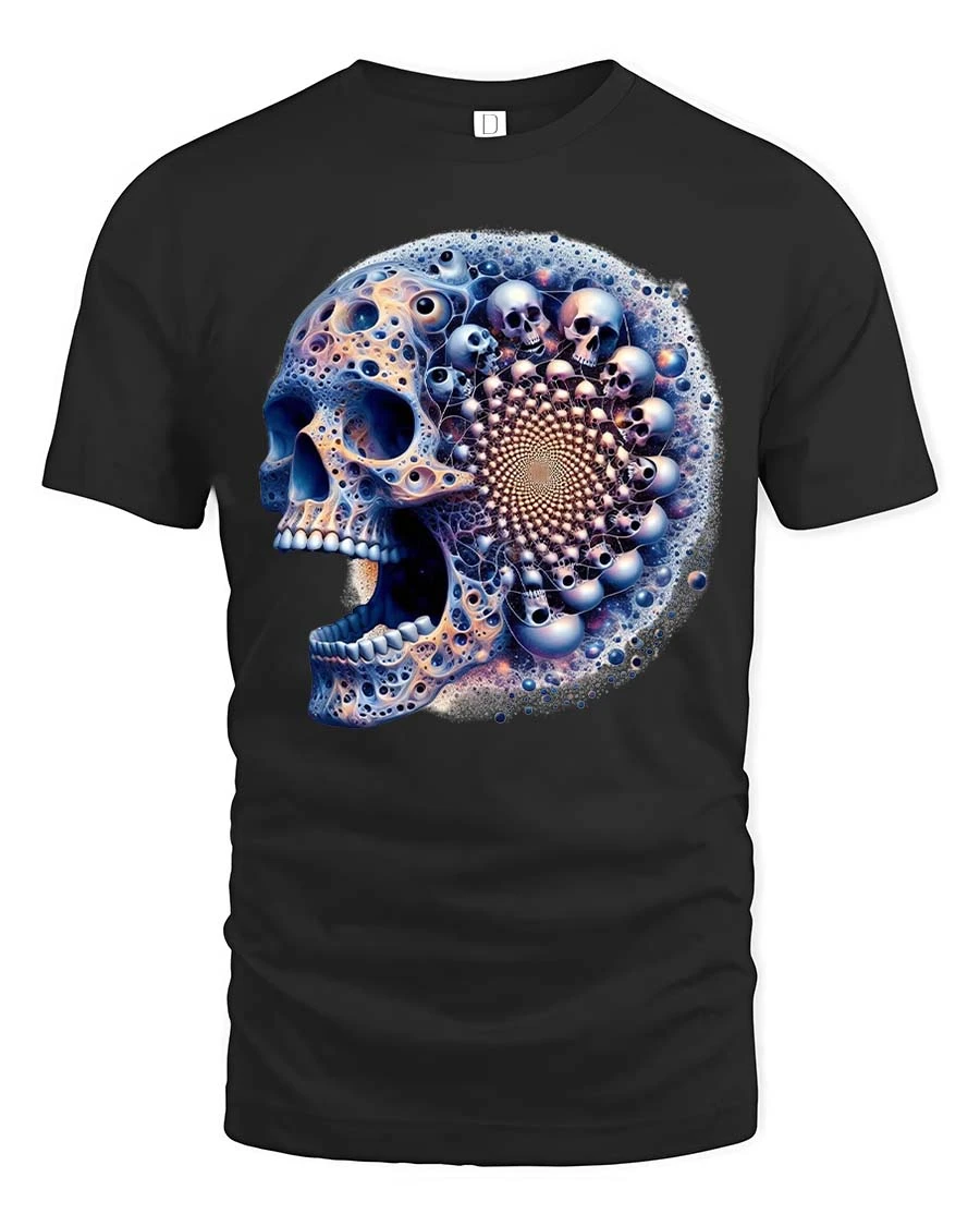 Fractal Skull T Shirt Psychedelic Cosmic Mind Bend Art Style features a mesmerizing skull design blended with intricate fractal patterns and surreal details.
