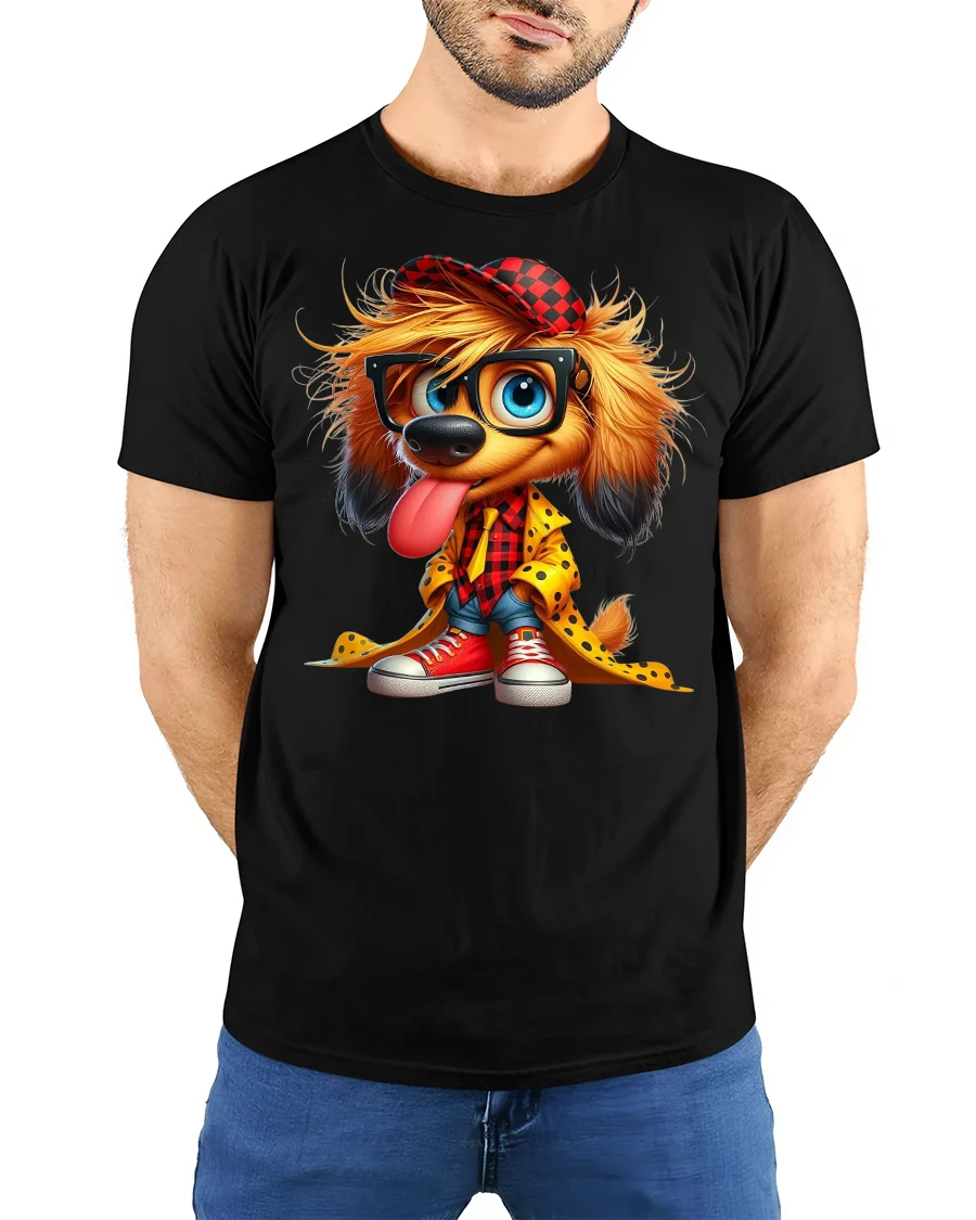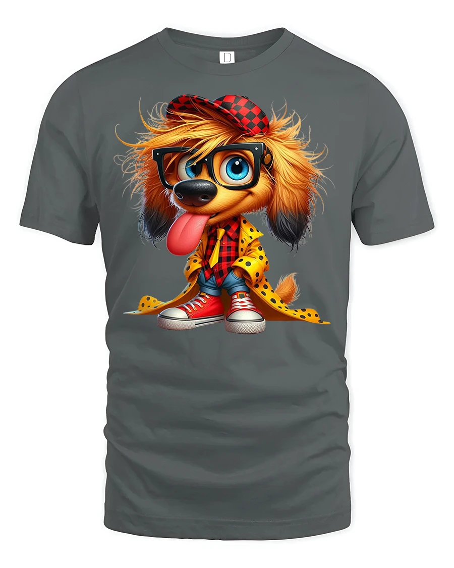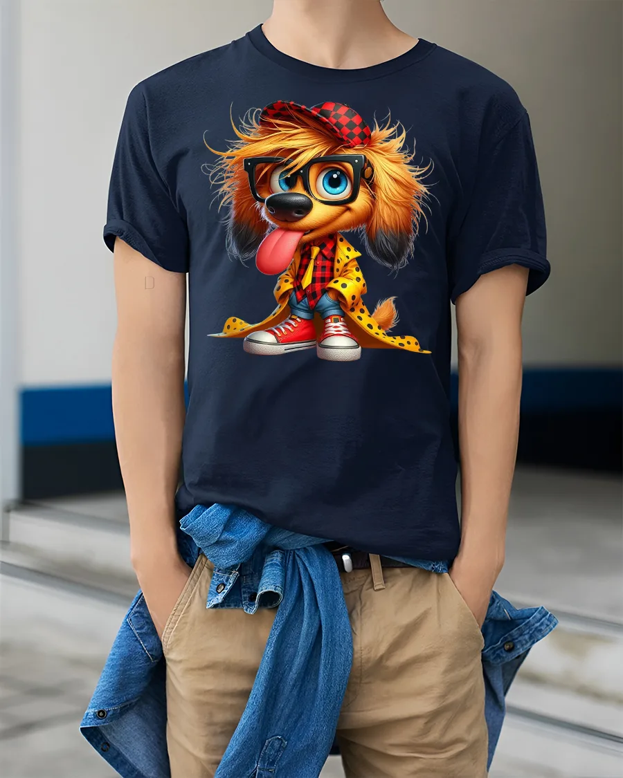 Add some playful charm to your style with our Funky Puppy Graphic T-Shirt. This bold design features an adorable puppy rocking oversized glasses, a red plaid shirt, bright sneakers, and a trendy yellow coat. The vibrant details and quirky fashion make it the perfect conversation starter for any casual occasion.