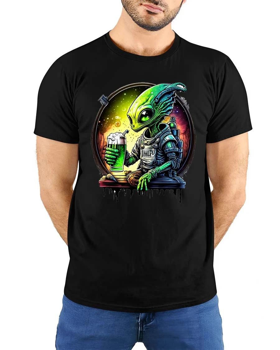 Funny Alien Drinking Beer Space Art Graphic T Shirt Tee blends humor and sci fi creativity into one eye catching design.