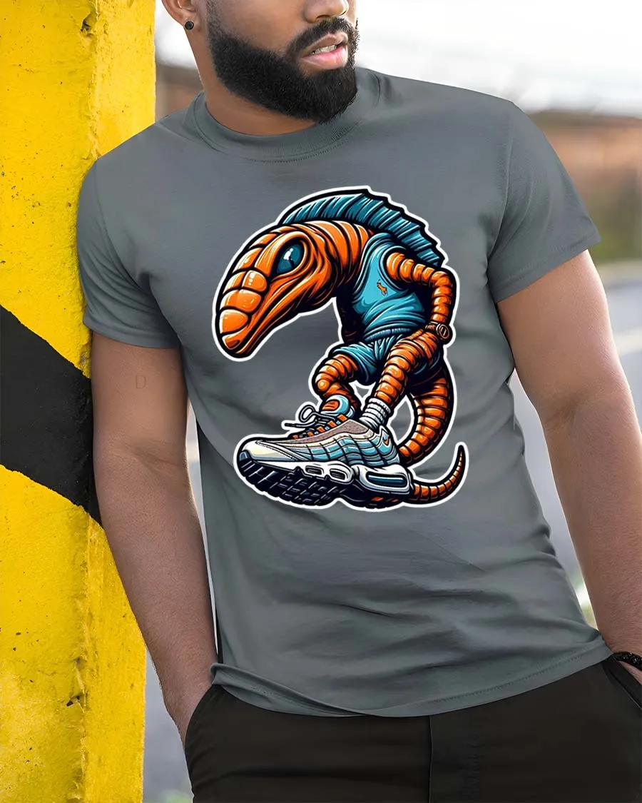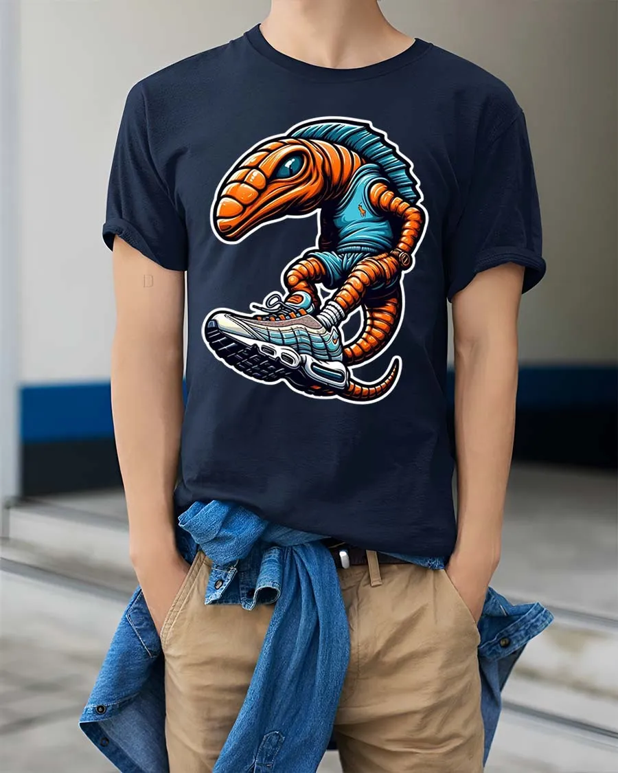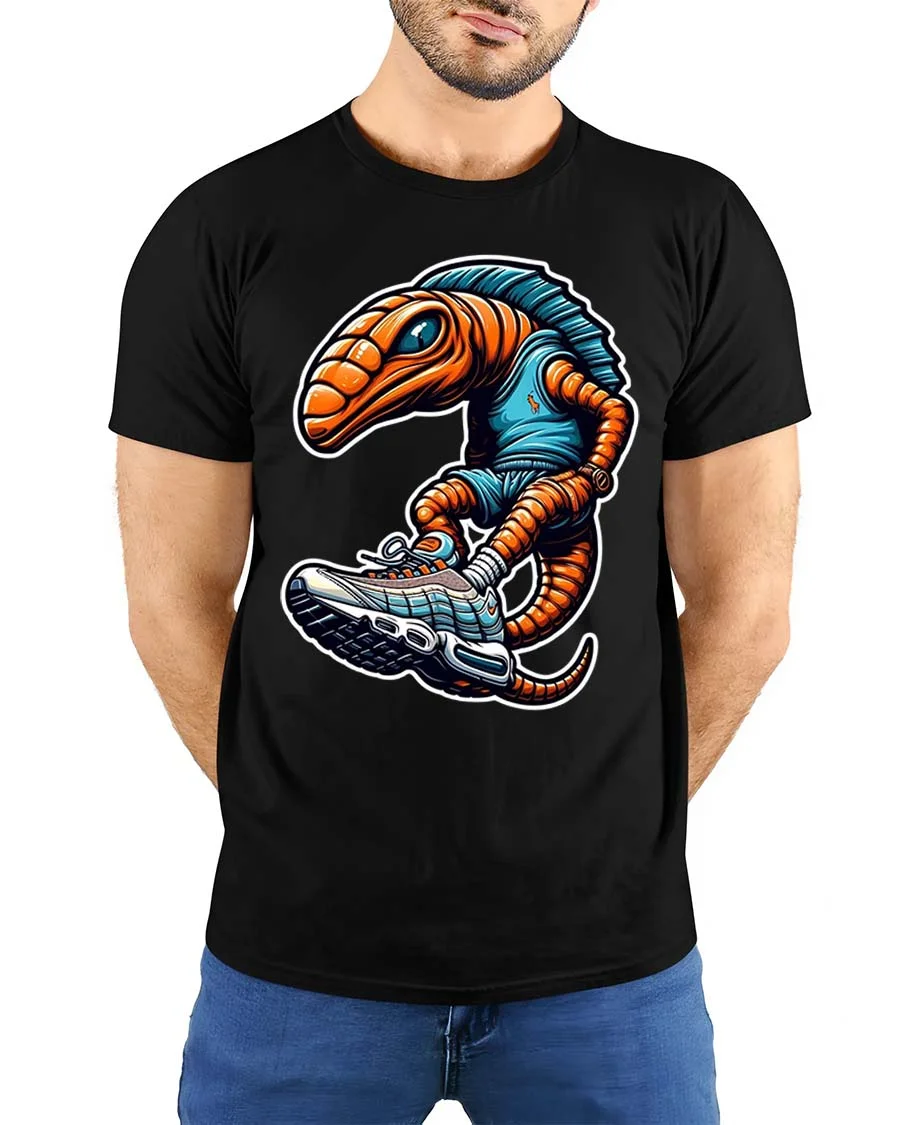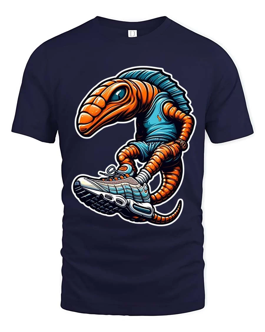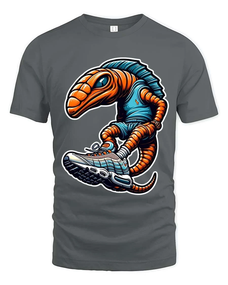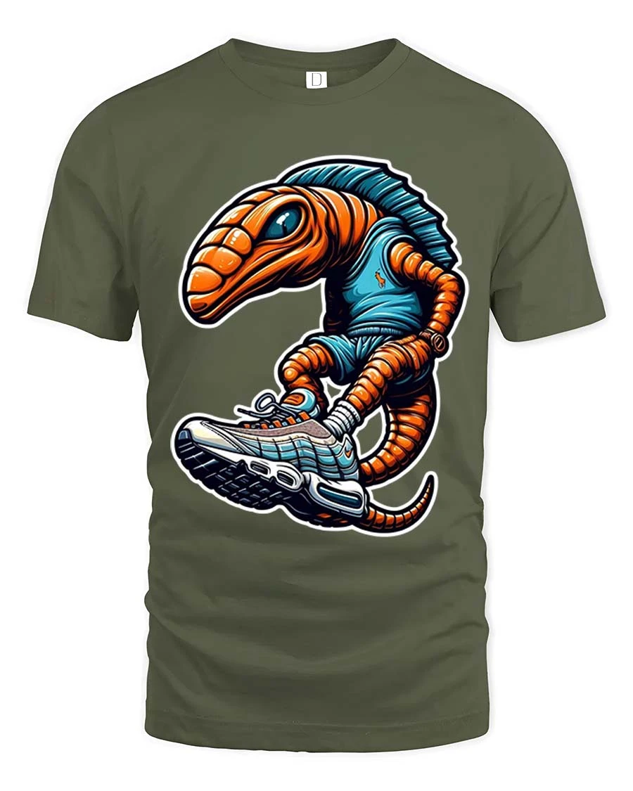 The artwork showcases a quirky alien character rocking oversized sneakers bringing a fun and modern twist to classic graphic tees.
