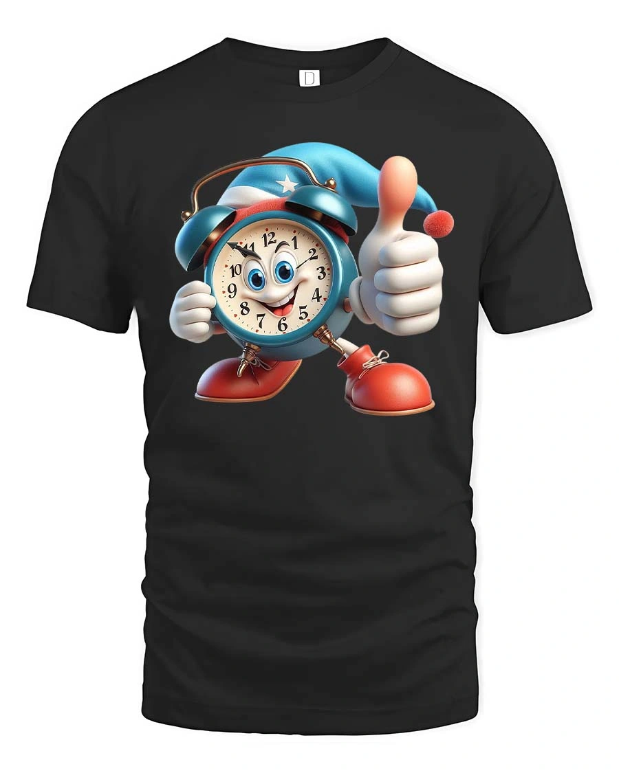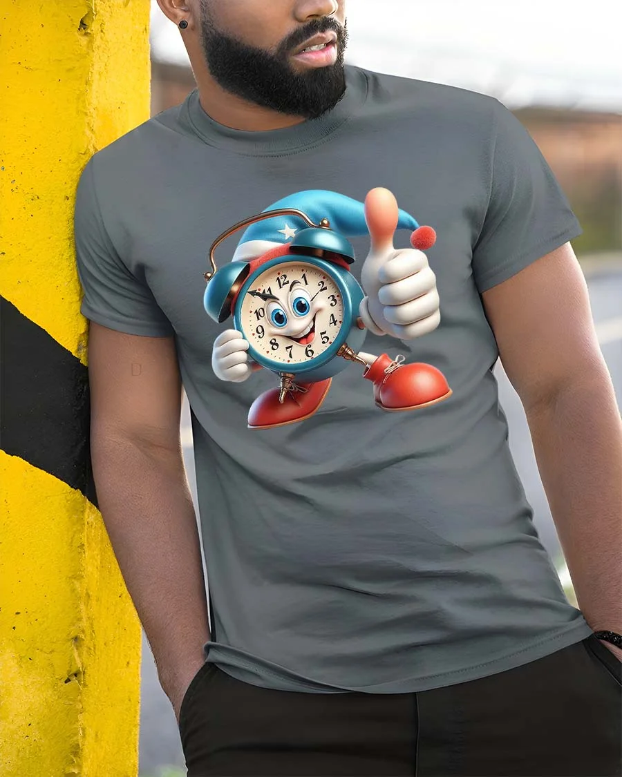 The playful clock character pairs easily with jeans, shorts, or casual streetwear outfits for a relaxed everyday look.