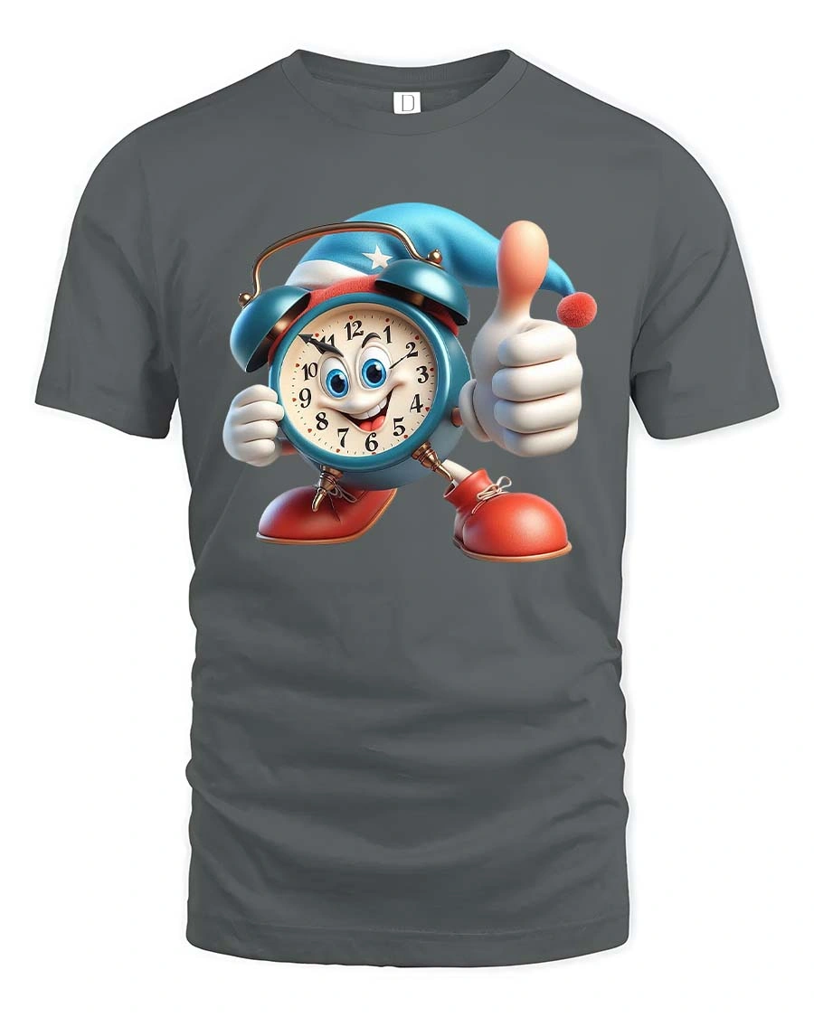 Funny Cartoon Alarm Clock Thumbs Up Graphic T Shirt Good Vibes features a cheerful cartoon clock character that brings playful energy and humor to everyday style.