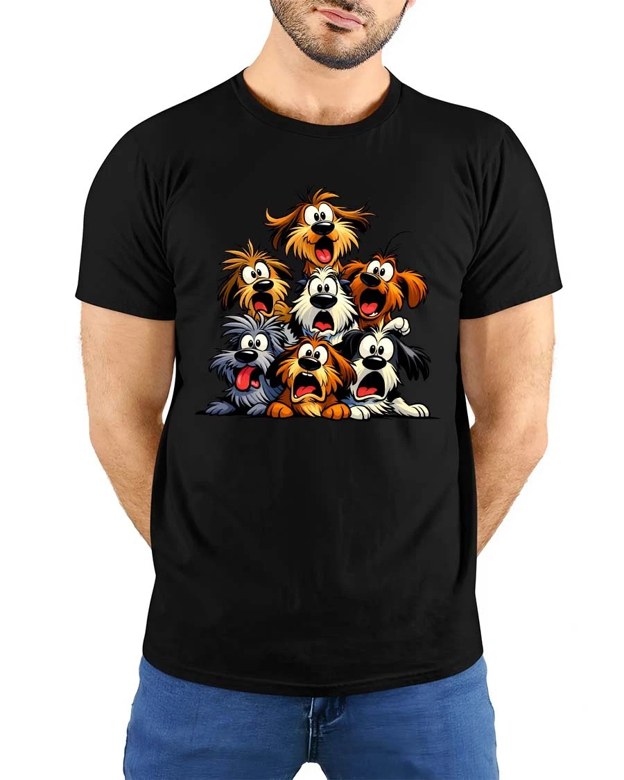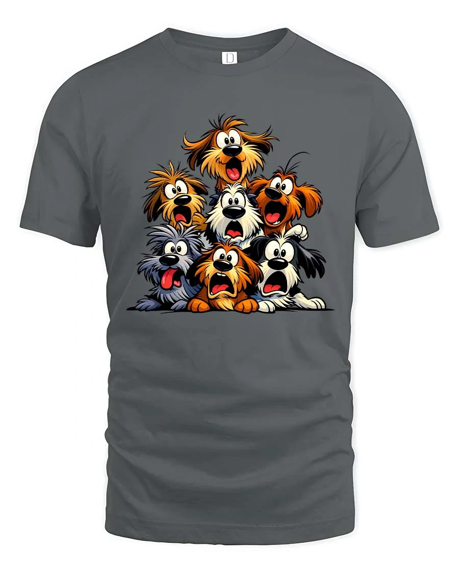 Perfect for dog lovers and fans of humorous cartoon art, this graphic tee captures the fun and chaos of a silly dog squad. The animated expressions and quirky personalities make the design feel cheerful, lighthearted, and full of character.