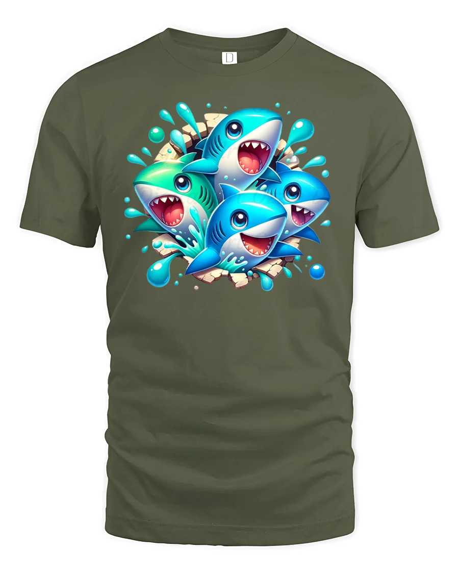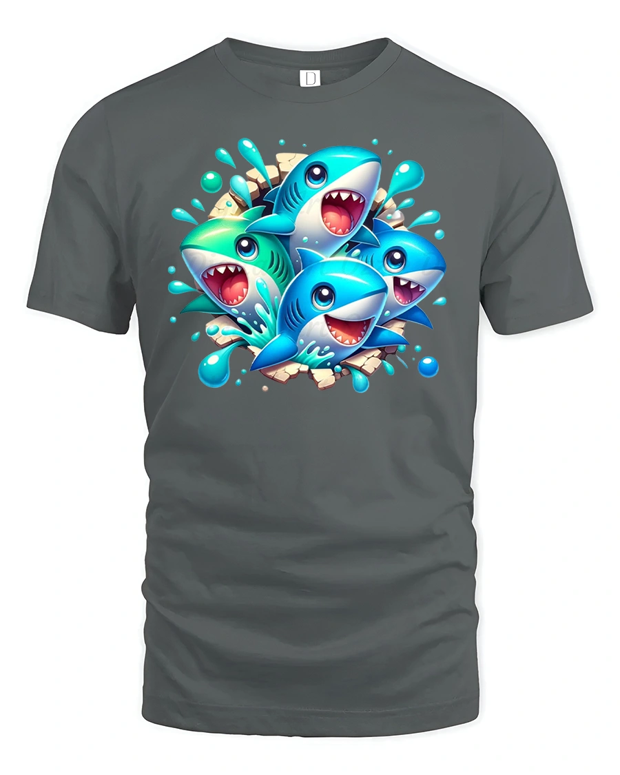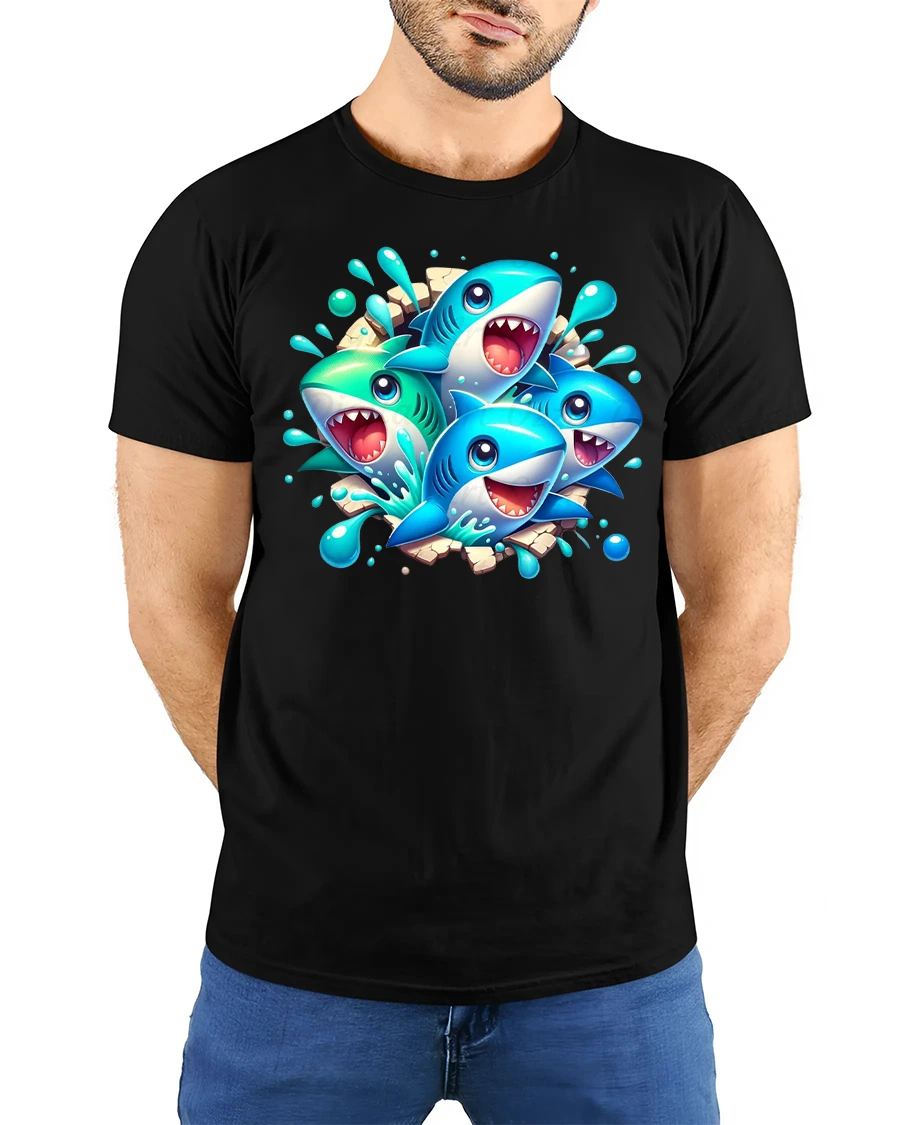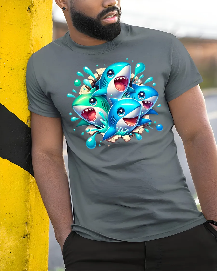 Funny Cartoon Shark Splash Party Graphic T-Shirt is the perfect blend of humor and style for anyone who loves sharks, cartoons, and fun designs. Featuring a group of colorful cartoon sharks bursting through with splashes of water, this graphic tee is a true attention-grabber. Made with premium-quality fabric, it provides a soft and breathable fit for everyday wear, keeping you comfortable all day long.