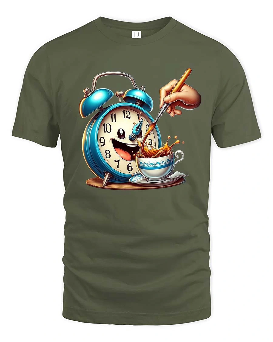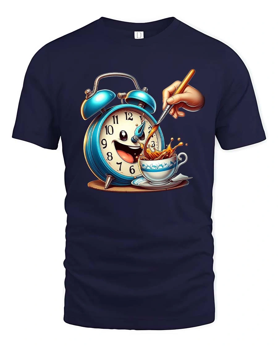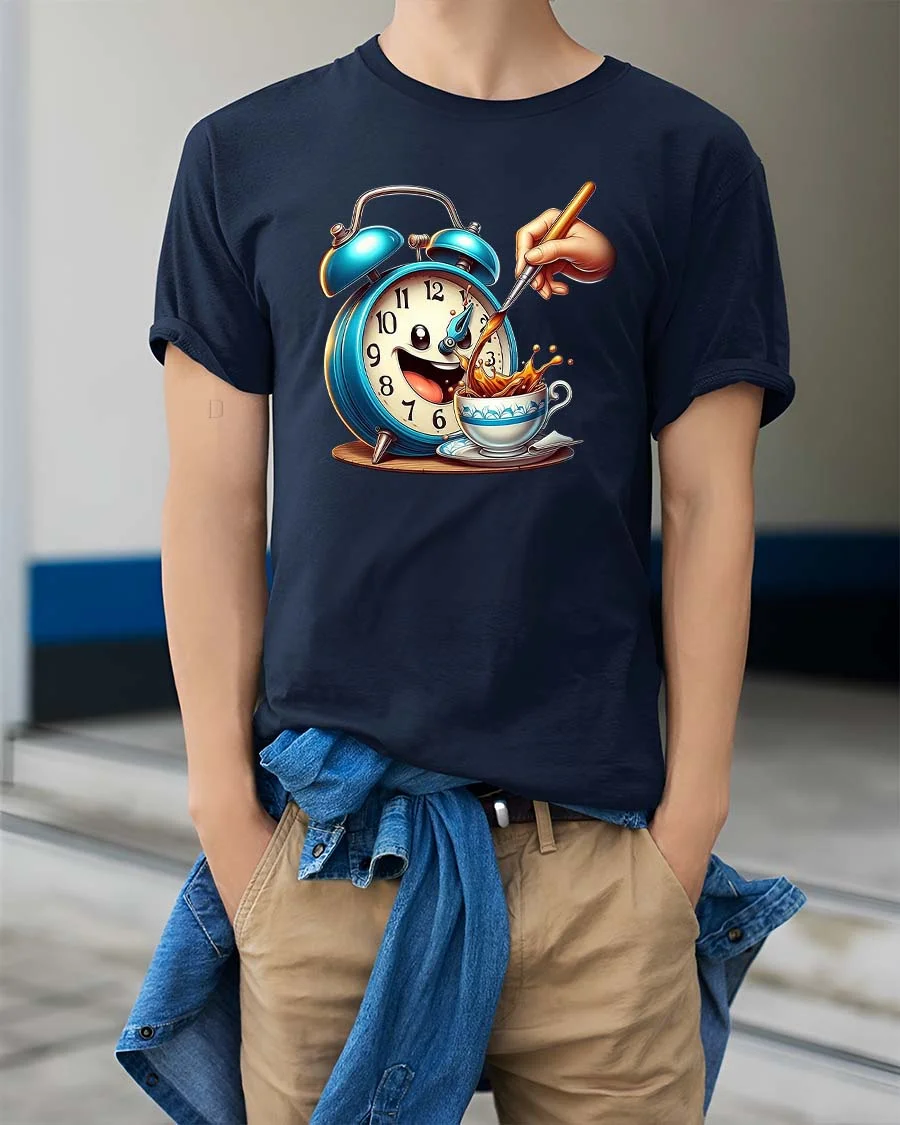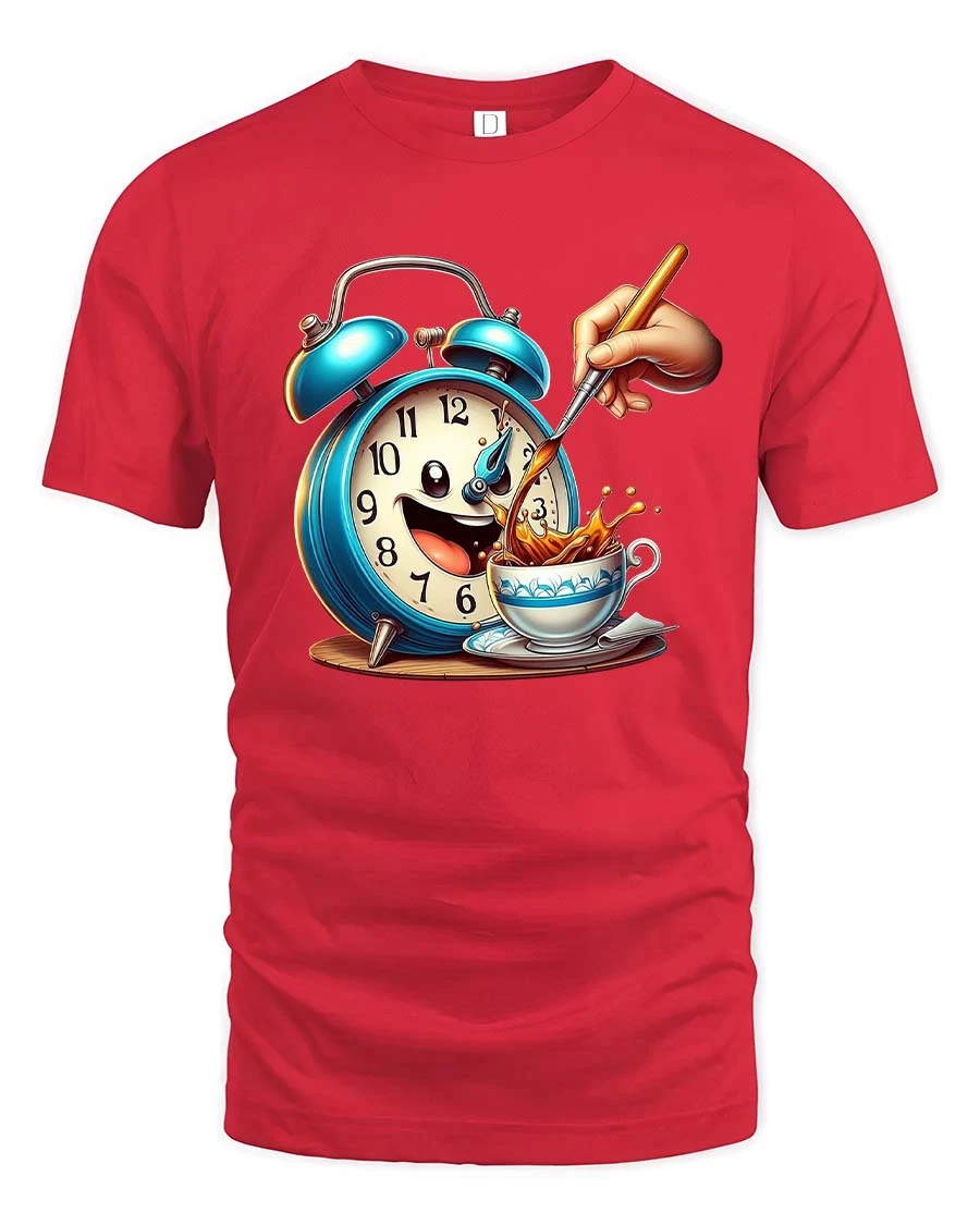Funny Coffee Alarm Clock Cartoon Graphic T Shirt Morning Mood captures the playful spirit of early mornings and the joy of a fresh cup of coffee.