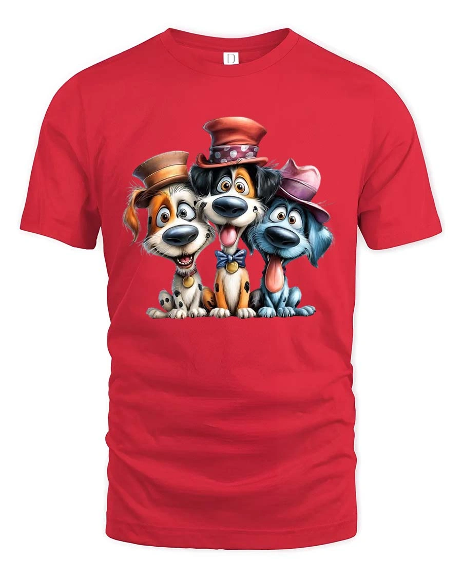 Funny Cute Dogs With Hats Graphic T Shirt Cartoon Puppy Tee - red t-shirt on white background