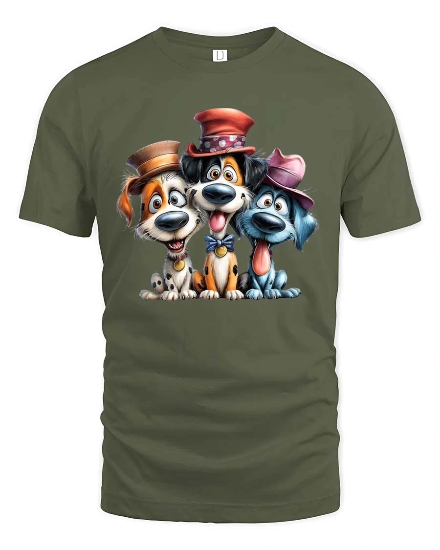 Funny Cute Dogs With Hats Graphic T Shirt Cartoon Puppy Tee - military green t-shirt on white background
