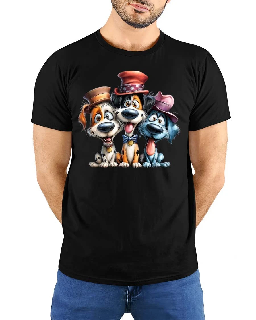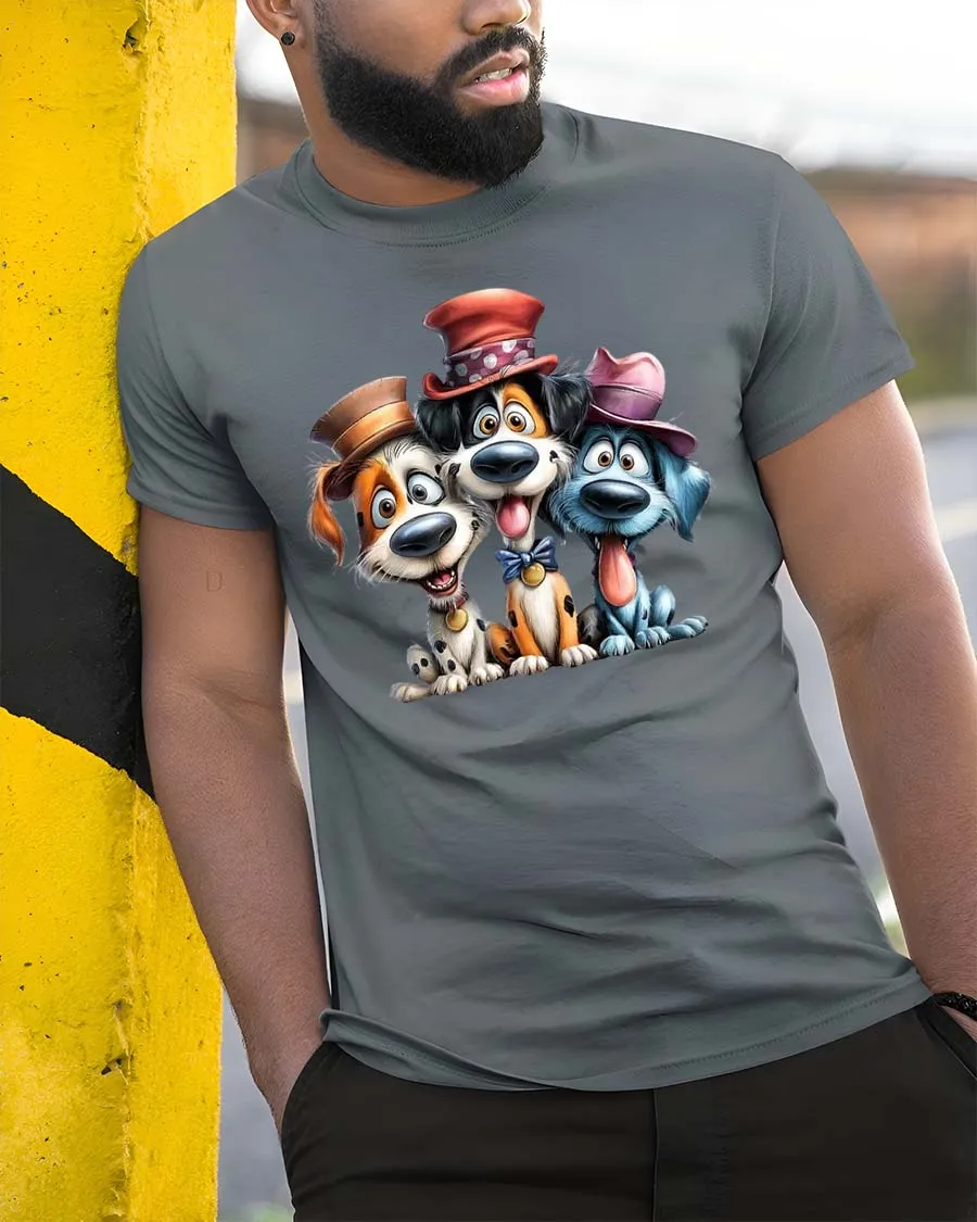 Funny Cute Dogs With Hats Graphic T Shirt Cartoon Puppy Tee features an adorable trio of playful dogs with expressive faces and charming hats.
