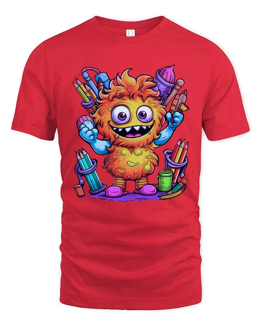Funny Cute Monster Artist Graphic T Shirt Colorful Cartoon Art Style - red t-shirt on white background