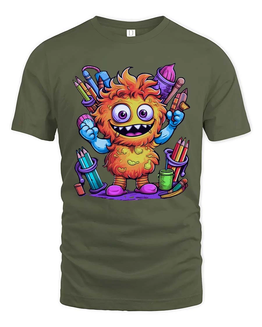 Funny Cute Monster Artist Graphic T Shirt Colorful Cartoon Art Style - military green t-shirt on white background