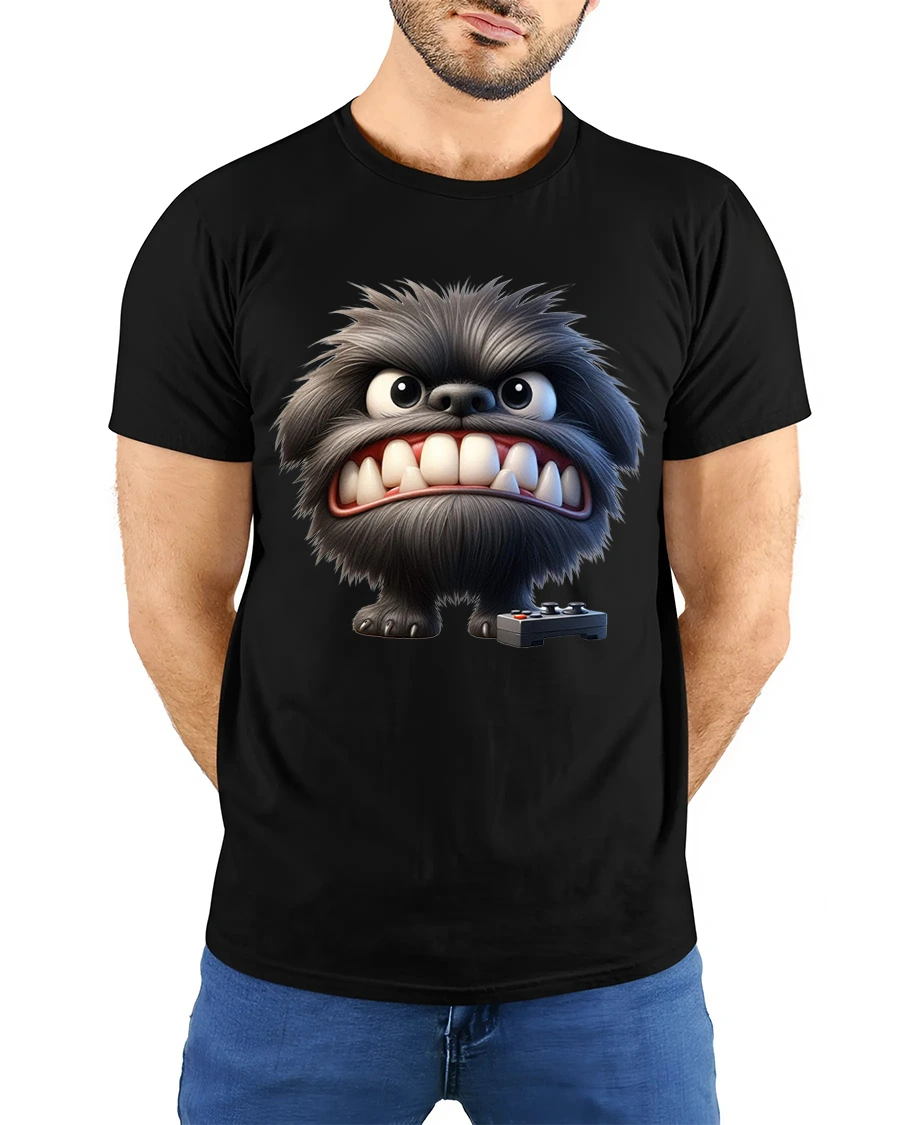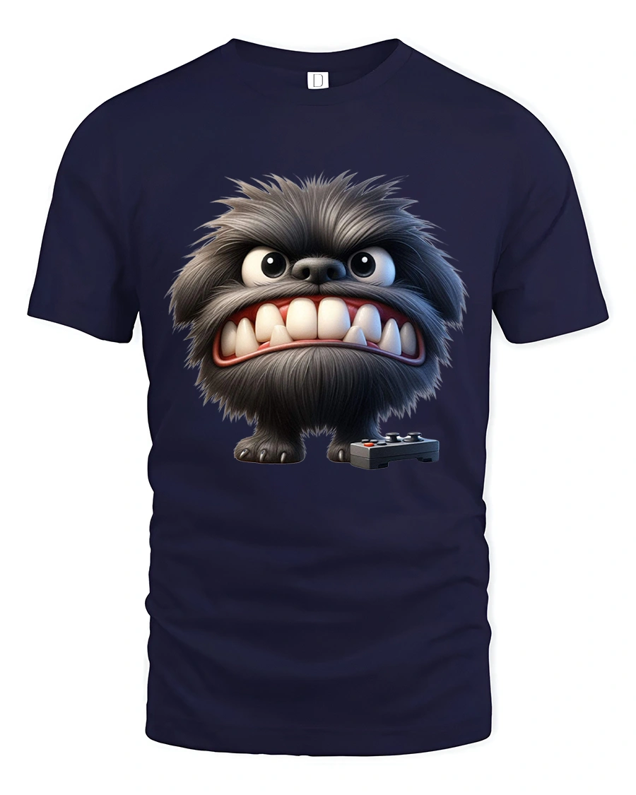 Funny Furry Monster Gamer Cartoon Big Teeth Graphic Tee Tshirt brings playful humor and gaming fun into a bold and adorable design.