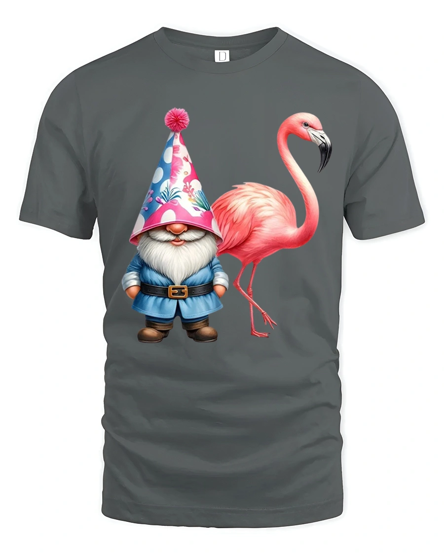 Funny Gnome And Flamingo Tee With Whimsical Party Vibes delivers a joyful mix of humor fantasy and playful imagination. The charming gnome wearing a festive hat paired with a stylish flamingo creates a surprising and delightful contrast that instantly grabs attention. The colorful illustration feels lighthearted fun and creative making this design stand out with personality and charm.