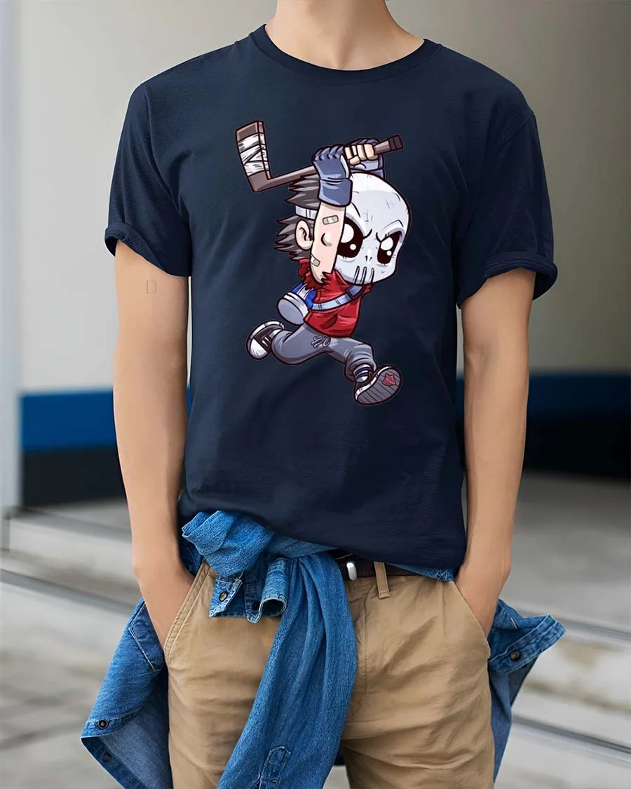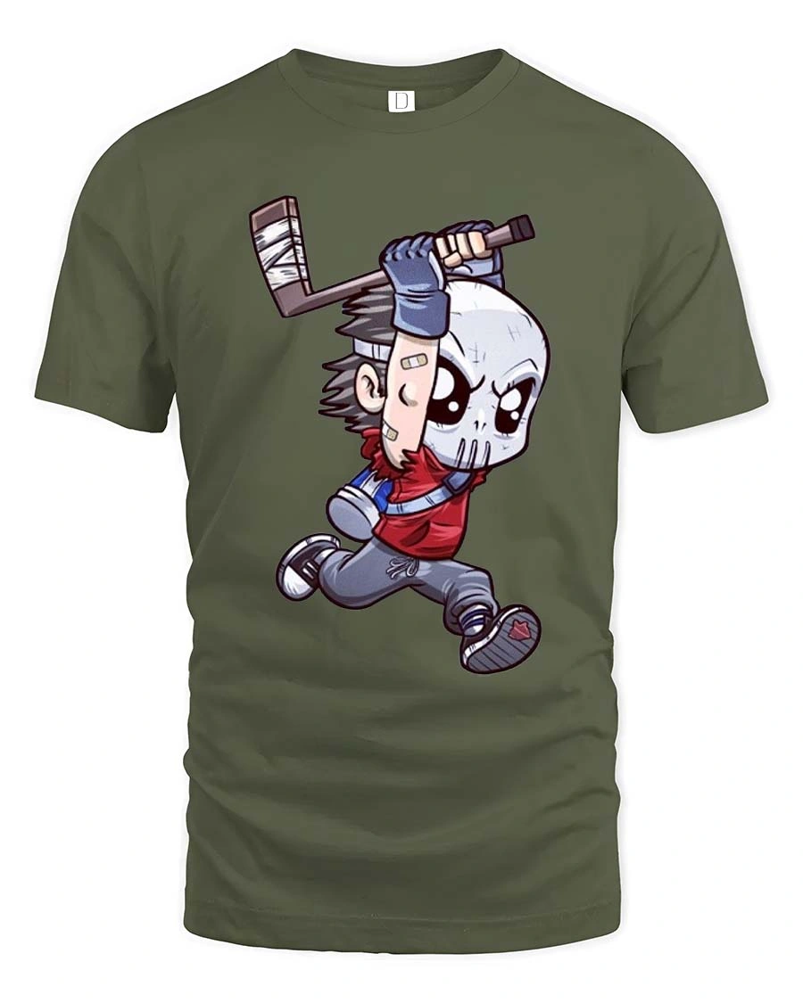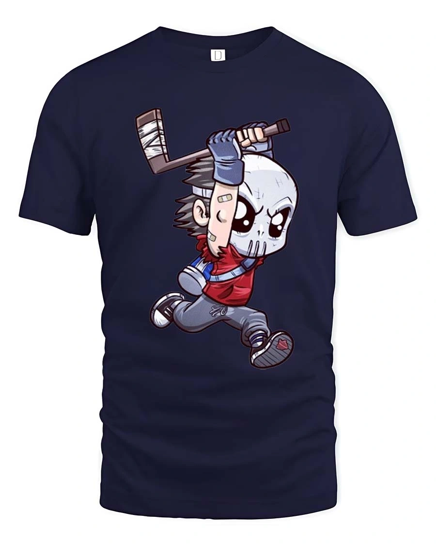 Funny Hockey Mask Cartoon T Shirt Slasher Style Graphic Tee features a playful character wearing a hockey mask while swinging a stick in a dynamic action pose.