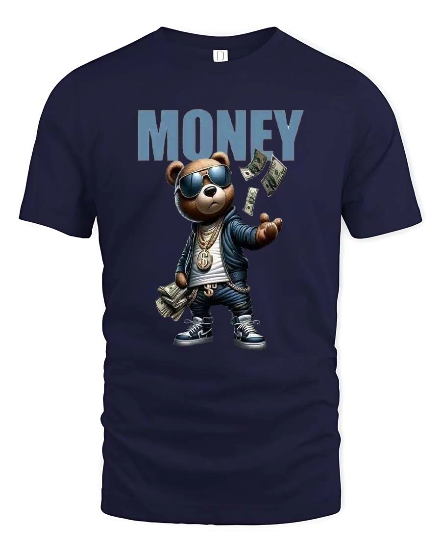 The graphic shows a stylish bear wearing sunglasses, chains, and sneakers while tossing cash into the air under the word MONEY.